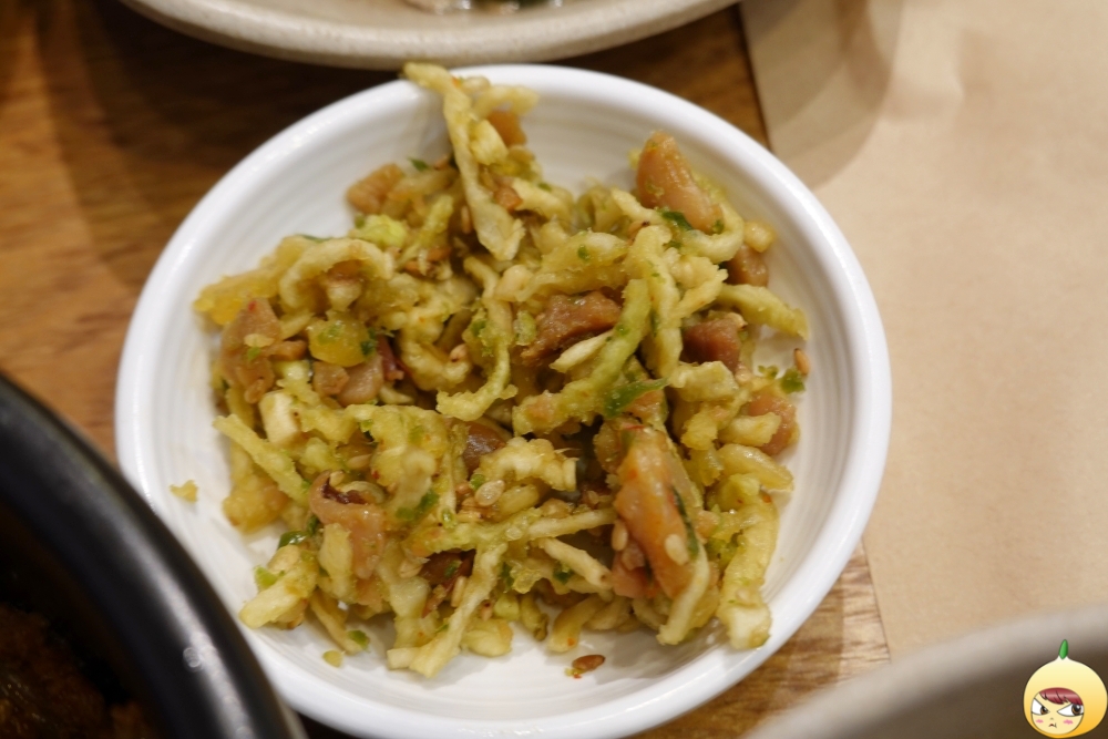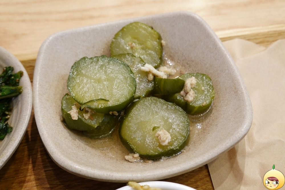 오징어로 무친 나물같은데 이건 염도가 엄청나다. 한입 먹는 순간 윽~ 짜다가 바로 나왔다. 오이장아찌인 듯 아닌듯, 장아찌 특유의 아삭함은 없고 물렁하다.
