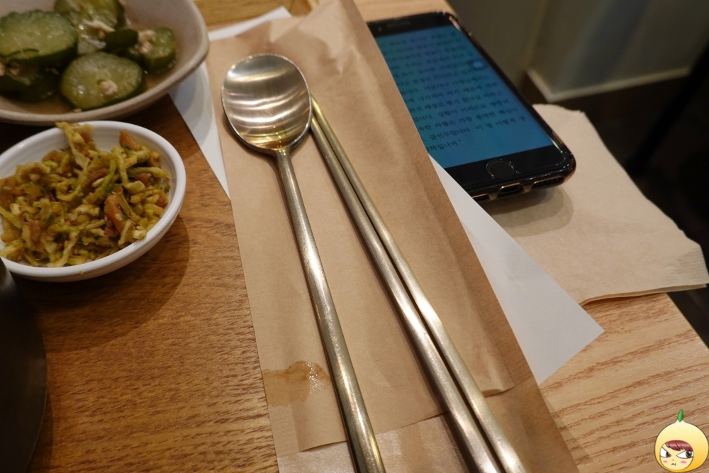 무말랭이를 된장에 버무린 거 같은데, 아삭한 식감만 날뿐 정체를 잘 모르겠다. 반찬은 아쉬움이 많지만, 산나물밥에 수저를 따로 준 거 맘에 든다. 요즘 개인수저를 구비할까 고민 중이다. 어쩔 수 없이 외식을 자주하는데, 공동수저통에 든 수저를 보면 이제는 거부감이 든다. 얼마나 많은 사람들이 저 통을 열어서 수저를 꺼냈을까? 코로나19 시대에 맞춰, 공동수저통은 이제 사라져야하지 않을까 싶다.