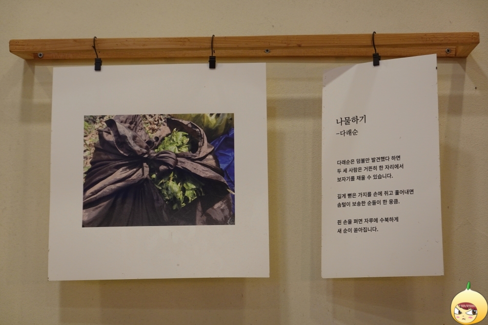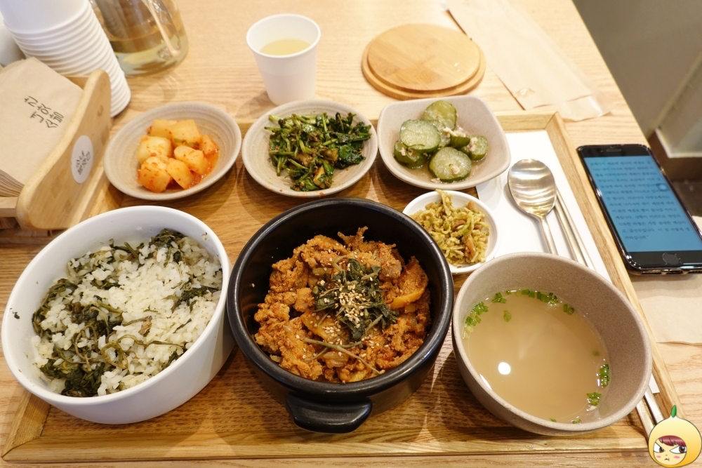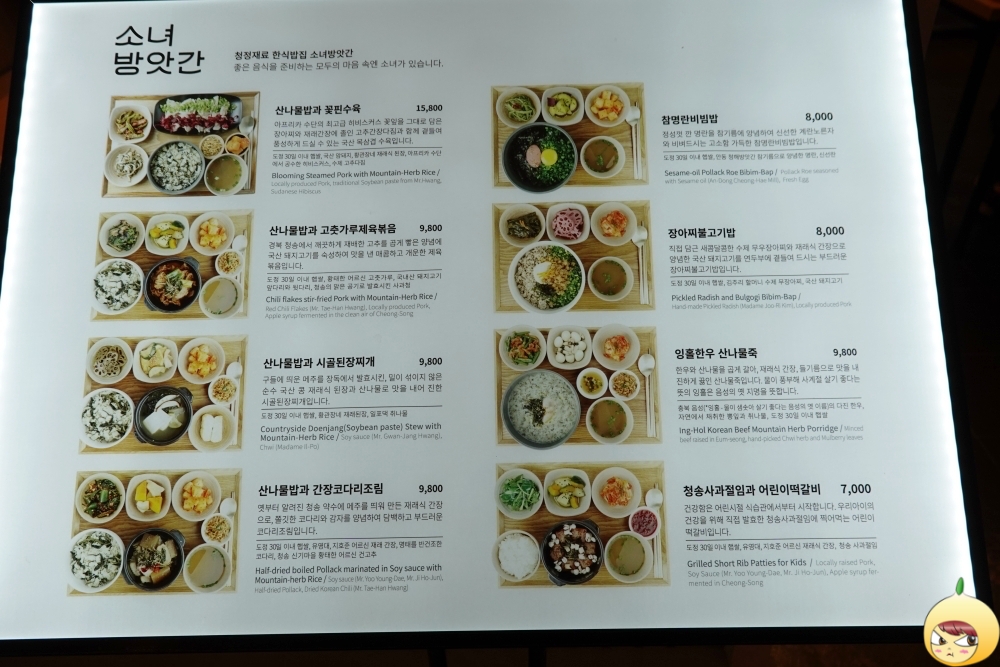 입구 앞에 있던 메뉴판. 산나물로 만든 밥이라니, 달래장을 넣어 쓱쓱 비비면 한그릇 뚝딱이다. 개인적으로 나물밥을 좋아하니, 여긴 내취향이로구나 했다. 뭐 먹지, 잠시 고민을 하고 산나물밥과 고춧가루제육볶음(9,800원)을 주문했다.