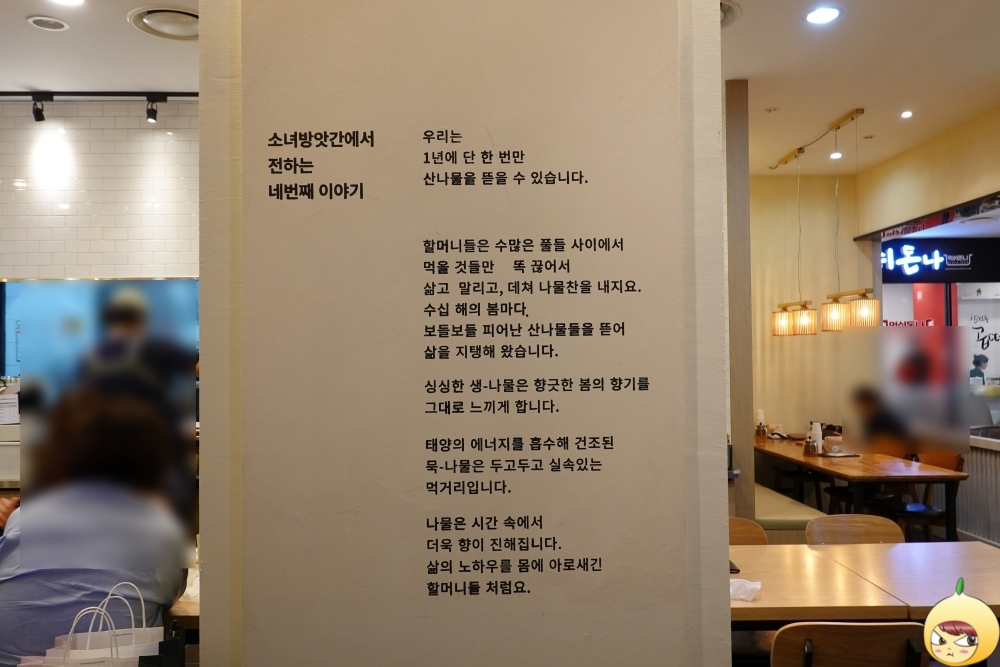 혼밥은 1시 넘어서, 예전에는 바쁜 점심시간대를 피해 갔는데, 요즈음 코로나19로 인해 2시를 넘어서 가는 경우도 종종 있다. 브레이크타임이면 어쩌나 했는데 백화점이라서 그런지 영업 중이다. 소녀방앗간, 이름은 많이 들어봤는데 어뗜 곳인지 잘 몰랐다. 글을 읽으니, 아마도 산나물과 관련된 음식이 나오나 보다.