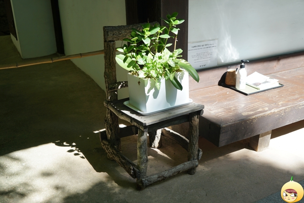 지난 봄에는 덩그러니 의자만 있었는데, 이번에는 화분이 있어 그나마 덜 외로워 보인다. 진영각 끄트머리에 있는 오래된 나무의자는 법정스님이 앉으셨던 의자다.