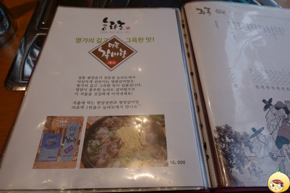 평양냉면을 시작으로 만둣국과 평양온반을 먹었다. 나름 혼밥용 음식을 다 먹었기에, 평냉으로 돌아가 다시 시작할까 했다. 그런데 주인공은 마지막이 아니라 뒷장에 있다고 해야 할까나? 메뉴판 뒷장에 명가의 깊고 그윽한 맛이라는 명품 갈비탕이 있다. 아마도 계절메뉴라서 그런가 보다. 그냥 갈비탕도 아니고, 명품 갈비탕(16,000원)이니 부담스런 가격이지만 스몰 럭셔리라 생각하고 주문을 했다.