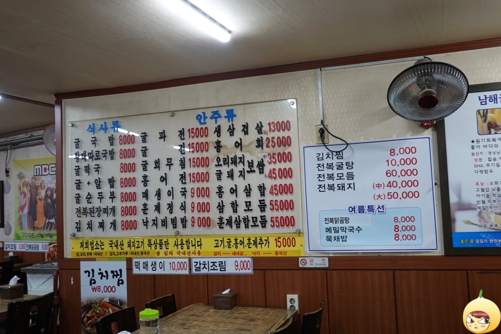 요즈음 모르겠는데, 예전에 라디오를 즐겨 들을때 '종로5가 ㅂㄹ약국' 광고가 어김없이 나왔다. 광고효과인지, 종로5가에 가면 항상 그 약국이 떠오른다. 남해굴떡국에 가려면 그곳을 지나쳐야 한다. 광고땜인지 다른 약국에 비해 사람이 꽤나 많다. 영양제라도 하나 살까 하다가, 제철음식이 보약이지 싶어 바로 식당으로 향했다. 굴국밥 집이라는데, 김치찜에 닭한마리에 홍어삼합까지 메뉴가 겁나 많다. 음... 제대로 찾아온 거 맞나 싶지만, 후진은 없다. 오로지 직진 뿐이다.