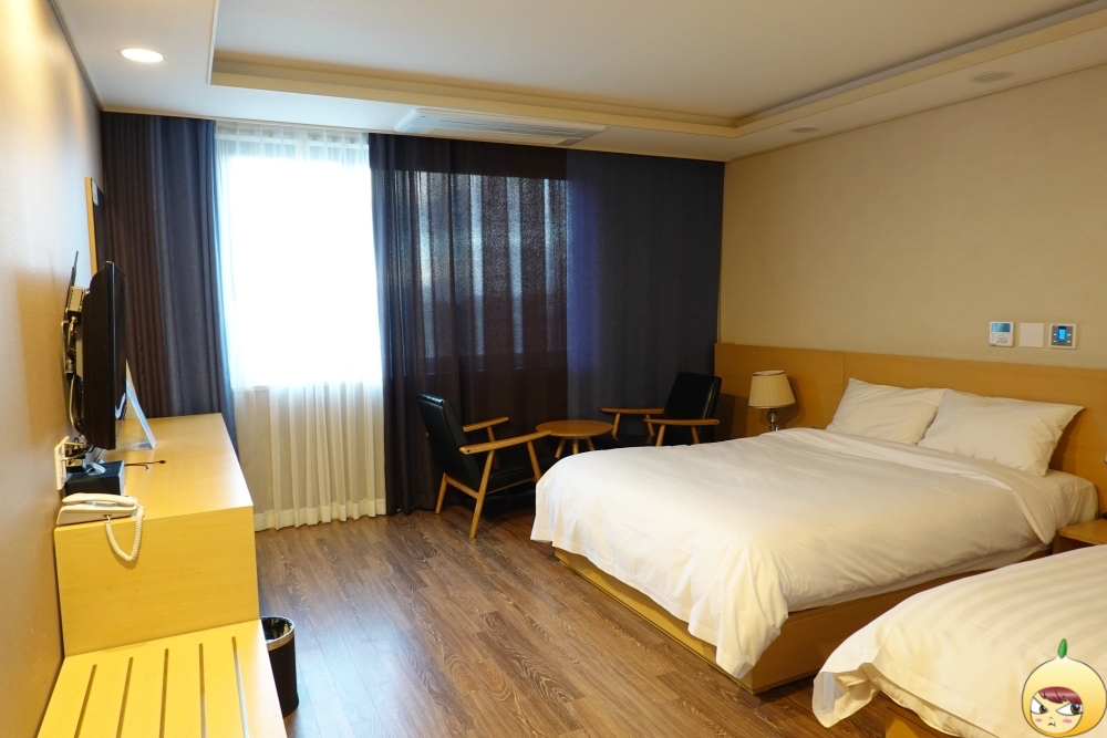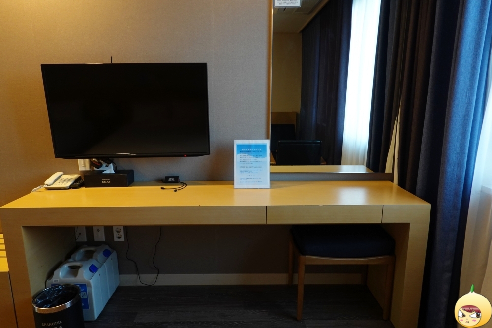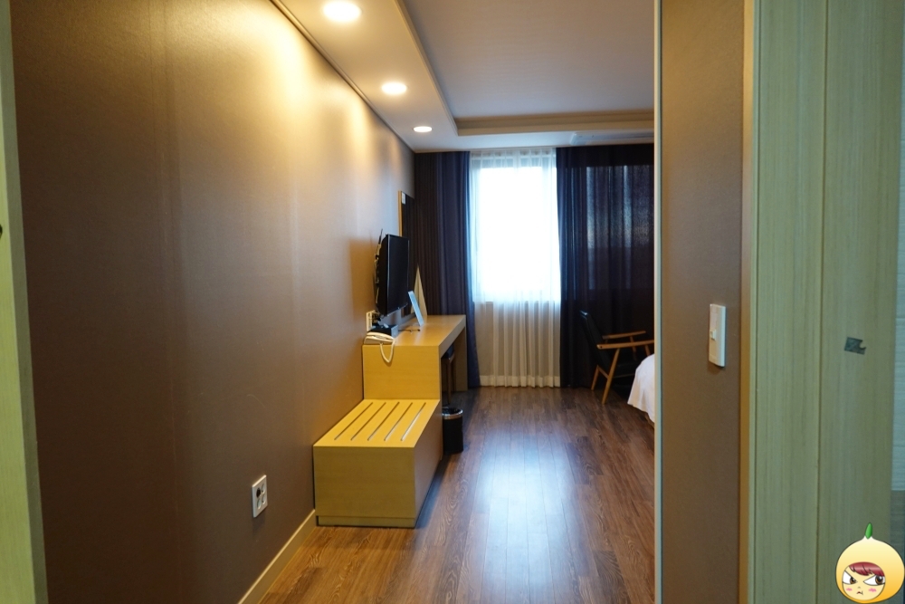 문을 열고 들어가니, 왼쪽에는 옷장이 있고, 오른쪽에는 화장실겸 욕실이 있다. 그곳을 지나 안쪽으로 좀 더 들어오면, 침대와 테이블 그리고 TV겸 화장대가 있다. 무지 넓다고는 할 수 없지만, 둘이서 하룻밤을 보내기에는 여유롭다.