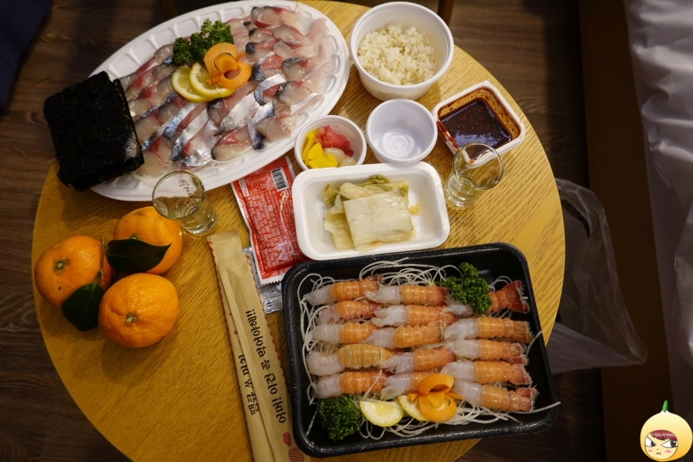 올랭이와 물꾸럭에서 13kg급 대방어회 코스를 먹었는데, 살짝 아쉬운 감이 있다. 숙소로 가던 중, 김선장 회센터가 보여 안으로 들어갔다. 식당서도 먹을 수 있지만, 포장도 된다. 다양하게 먹을 수 있는 세트메뉴가 있던데, 1차를 했기에 간단하게 단품으로 딱새우회와 고등어회(합쳐서 45,000원)를 주문했다. 딱새우는 고소고소고소할 뿐이고, 신선한 고등어회에는 비린내가 일절 없다. 그냥 먹어도 좋지만, 백김치을 더하면 상큼해지고, 김에 밥과 특제소스를 더하면 괜찮은 고등어초밥으로 변한다.