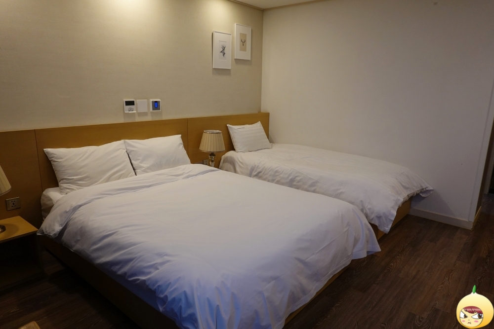 침대는 더블베드와 싱글베드 각각 하나씩 있다. 침구는 여느 호텔처럼 까끌까끌하고 뽀송뽀송하다. 지금은 각잡히게 잘 정돈되어 있지만 다음날이 되면 엉망진창으로 변할 것이다.