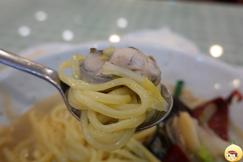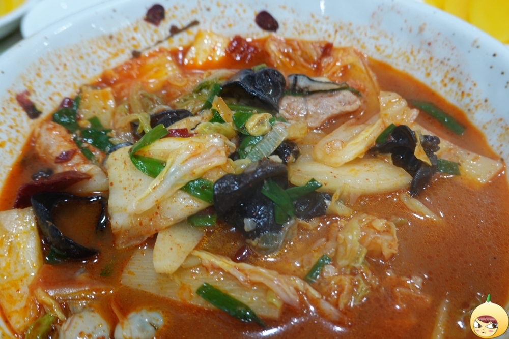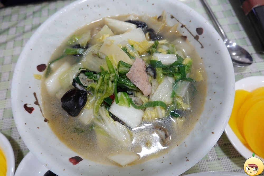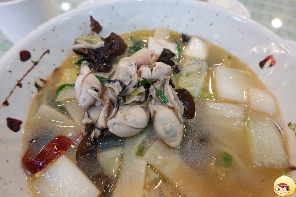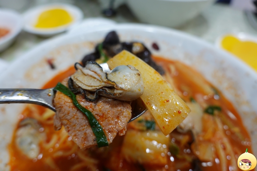 굴짬뽕이니, 굴은 당연히 가득 들어 있고, 조금이지만 돼지고기도 들어있다. 죽순, 부추, 목이버섯 그리고 배추 등 시원한 국물맛을 내는 채소도 들어 있다.