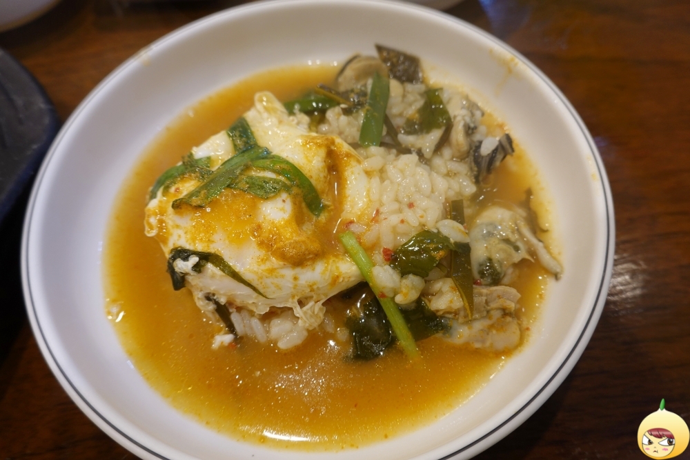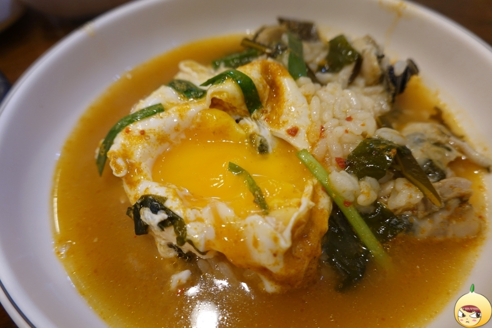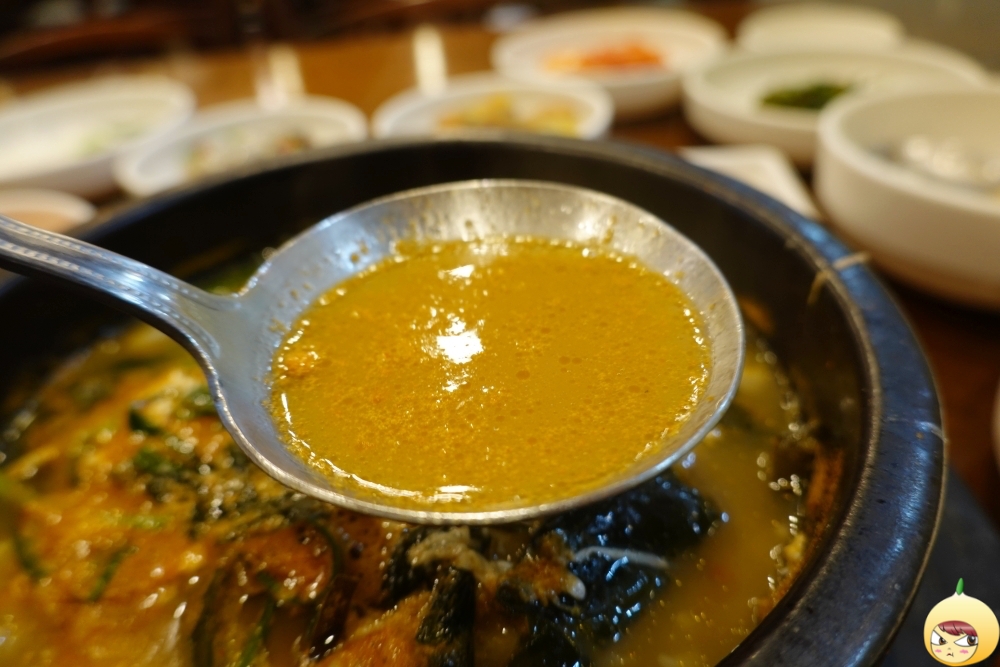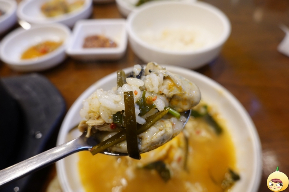 멍게는 아주 작은 알갱이로 국물에 퍼져 있지만, 국물 전체를 멍게라고 해도 될 정도로 멍게향 가득이다. 뜨거운 뚝배기라 국자로 덜고 있는데, 계란이 들어 있다. 노른자는 터지지 않고 반숙이다.