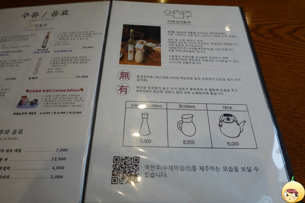 이번 목적은 역전주를 마시기 위해서다. 지난번에는 약을 먹고 있어 포기를 해야 했지만, 지금은 자유롭다. 고로 낮술 한잔을 해야겠다. 아스파탐같은 합성감미료는 일절 넣지 않고 오직 쌀, 누룩, 물로만 빚었단다. 역전주가 되려면 100일동안 숙성을 해야 한다니, 그 맛 살짝 기대해봐도 될 듯 싶다. 500ml가 끌리긴 하나, 낮술이니 가볍게 280ml(5,000원)로 주문했다.
