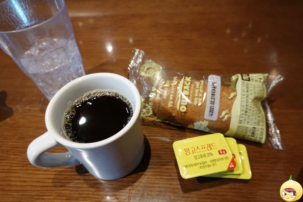 런치세트의 마지막은 커피다. 연하게 해달라고 부탁했는데, 그럼에도 불구하고 무지 쓰다. 담에는 커피맛 나는 물이 될 정도로 무지 연하게 해달라고 강조해야겠다. 참, 부시맨빵은 1인당 한개씩 포장이 가능하다. 넉넉하게 망고스프레드를 3개씩이라 챙겨주는 센스, 아주 맘에 든다.