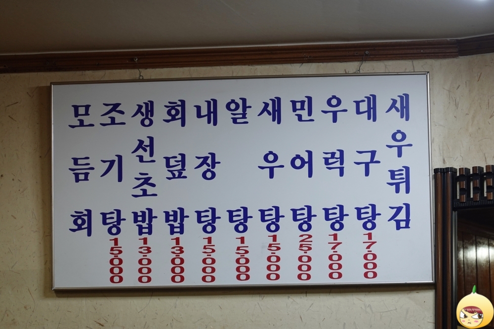 내장탕을 먹었고, 대구탕도 먹었으니 이번에는 제철 조기탕이다. 자리에 앉자마자 조기탕 주세요라고 하니, 안된단다. 헉~ 그럼 혹시 우럭탕은 되나요라고 물어보니, 역시나 안된단다. 생선은 주로 자연산과 국내산을 사용하고 있는데, 우럭과 조기를 못구해서 없단다. 잠시 멘붕이 왔지만 바로 정신을 차리고, 알탕(15,000원)을 주문했다.