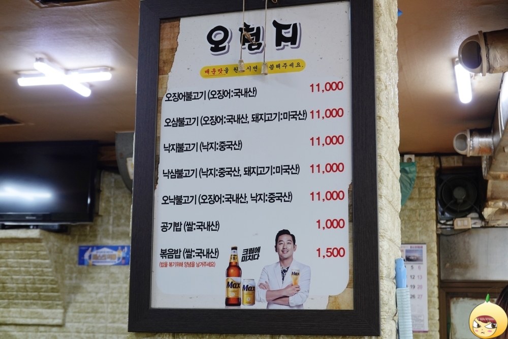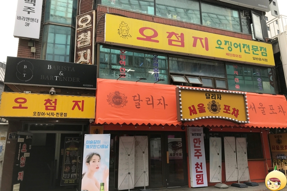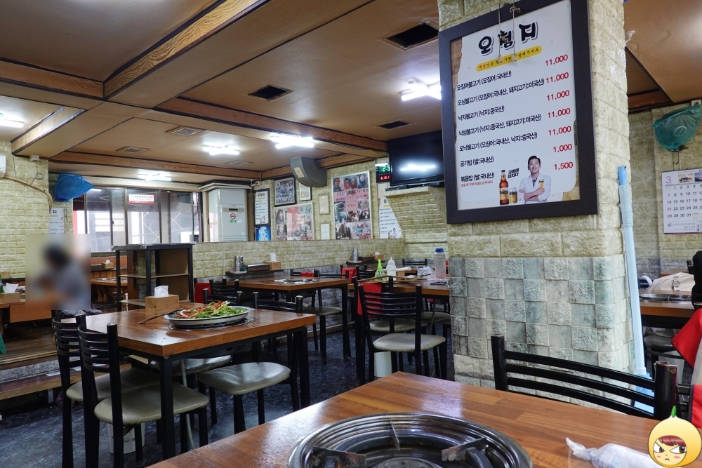 매운맛을 우습게 보던 시절에는 종종 찾았는데, 변함없이 그 매운맛을 지키고 있을까? 맵린이가 되어버린 지금은 두렵고 떨리지만 용기(?)를 내보기로 했다. 혼밥으로 백순대볶음보다는 오징어불고기가 더 나으니깐. 넘 오랜만이라 지도앱의 도움을 받아서 왔는데, 오첨지 간판을 보자마자 반가움에 괜스레 웃음이 났다.