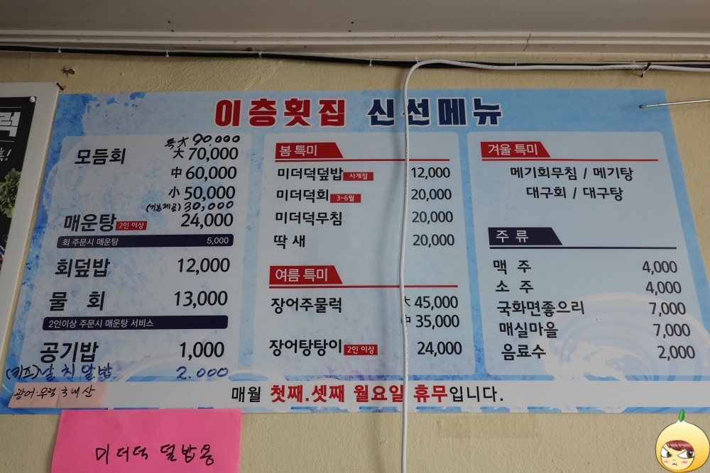 여럿이 왔다면, 매운탕까지 먹었을테지만 혼밥이라 미더덕에 집중하기로 했다. 미더덕덮밥(12,000원)은 필수, 여기에 미더덕회(20,000원)추가했다. 계절별로 특미가 있으니, 적어도 3번은 와야겠다. 매월 첫째, 셋째 월요일은 휴무.
