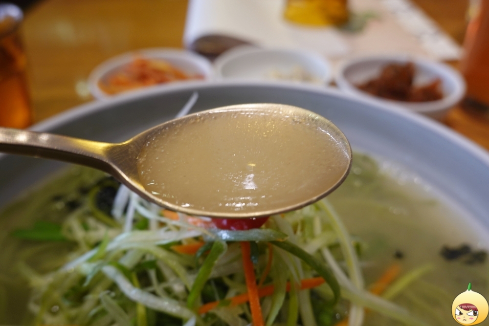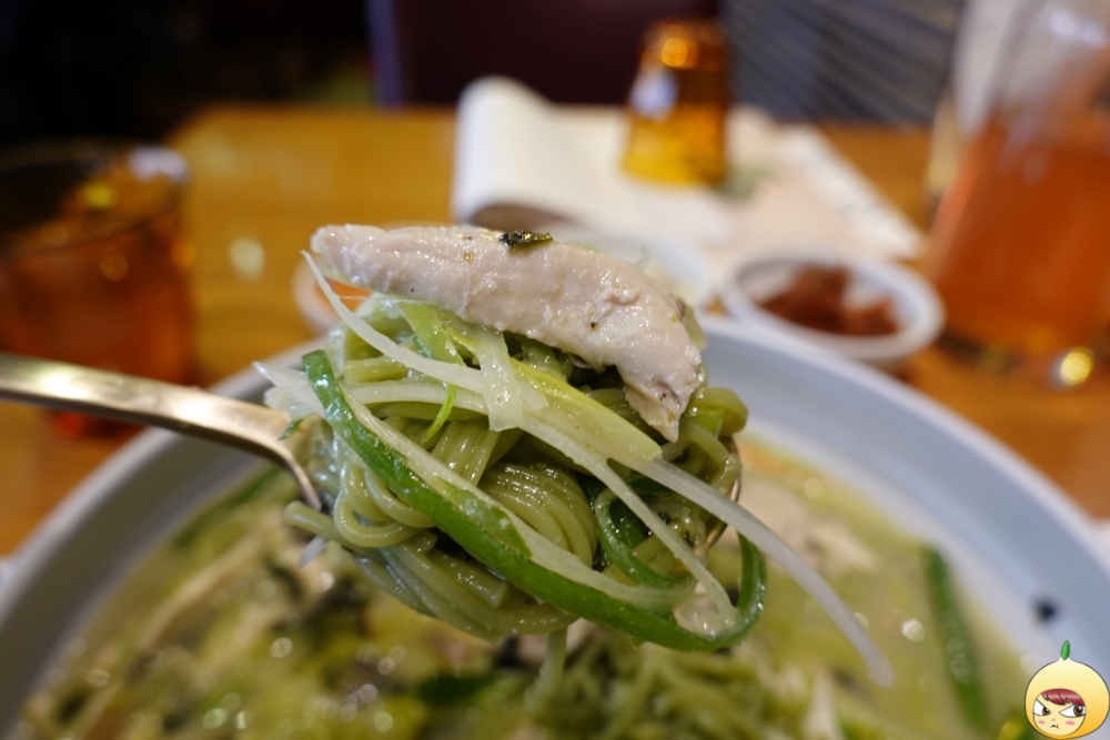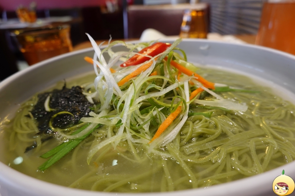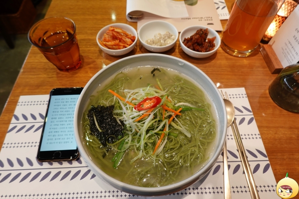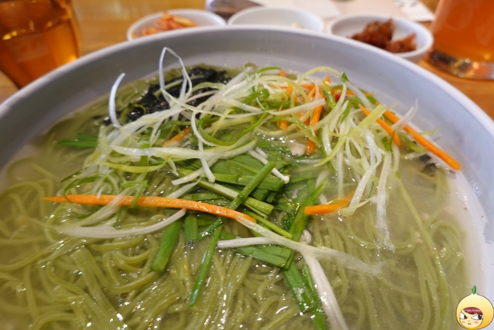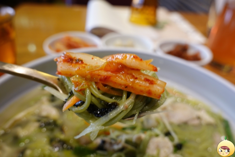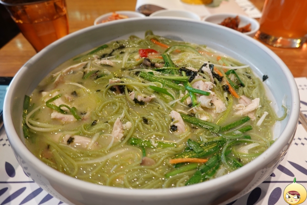 쫄깃한 국수면발을 원한다면 포기해야 한다. 사진을 찍느라 시간이 지나기도 했지만, 처음부터 면발 상태는 쫄깃과는 거리가 있어 보인다. 툭툭 끊기는 면이지만, 클로렐라 때문인지 밀가루 특유의 풋내는 전혀 나지 않는다. 면만 먹으면 저작운동을 오래 할 필요가 없지만, 닭고기가 있기에 꼭꼭 씹어야 한다.