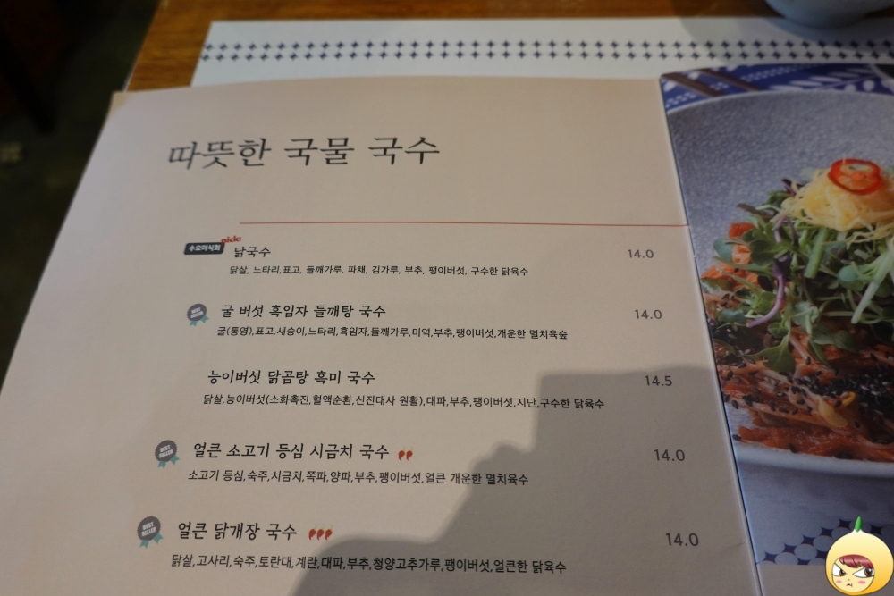 폭풍검색을 해서 찾아낸 곳이라 메뉴에 대해 미리 알고 오긴 했지만, 그럼에도 불구하고 종류가 참 많다. 얼큰한 닭개장 국수에 능이버섯 닭곰탕 흑미국수도 끌리지만, 사발은 처음이니 이집의 대표 메뉴를 먹어야 한다. 고로 대표이자 시그니처인 닭국수(14,000원)를 주문했다.