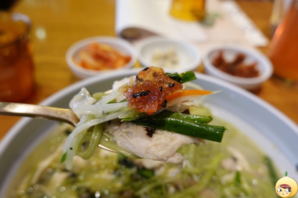 위에 올려진 고명을 제거하고 나니, 녹색면이 등장했다. 혹시했는데, 역시 클로렐라 면이 맞다. 예전에 클로렐라 면으로 만든 라면을 먹은 적이 있는데, 여기서 보니 새삼 반갑다. 밀가루가 더 많이 들어 있을테지만, 그래도 건강한 느낌이 든다. 닭국수에 닭이 빠지면 안되는 법. 닭은 뼈와 껍질은 없고 오직 순살만 들어있다.