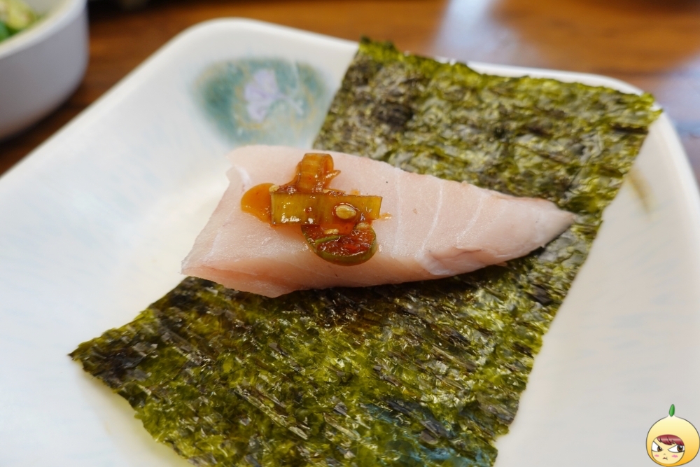 개인적으로 참치회를 먹을때, 조미김에 기름장은 절대 먹는 않는다. 그 어떤 회가 됐든, 간장과 고추냉이면 된다. 그런데 삼치회는 그 흔한 간장에 고추냉이가 보이지 않는다. 이유를 물어보니, 먹는 방법이 다른단다. 우선 생김(살짝 구은 듯)을 깔고, 삼치회를 올리고 여기에 양념간장을 추가하면 된단다. 개인 기호에 따라 갓김치나 배추김치를 추가하란다. 알려준 방법대로 먹을까 하다가, 첫입이니 삼치회에 양념간장만 올려서 먹었다. 회에 엄청난 맛을 기대하지 않는데, 삼치회는 맛이라고 하기에는 너무나도 허전하다. 양념간장 맛만 날뿐, 회맛은 목넘김 후 아주 희미하게 삼치향이 올라온다.