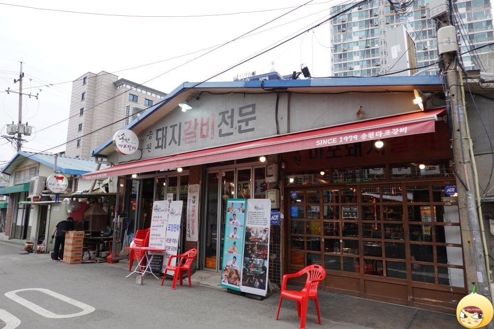 맛있는 녀석들은 먹는 방송 중 유일하게 보고 또 보는 프로그램이다. 유튜브와 넷플릭스로 지난 영상을, 금요일에는 본방사수를 한다. 대흥동에 있는 고등어김치찜처럼 송원마포돼지갈비도 방송에 여러번 소개가 됐는데, 혼자는 부끄러워서 근처에 있는 영일분식에서 칼비빔국수를 먹곤 했다. 하지만 혼자가 아니고 둘이 왔으니 당당하게 들어간다.