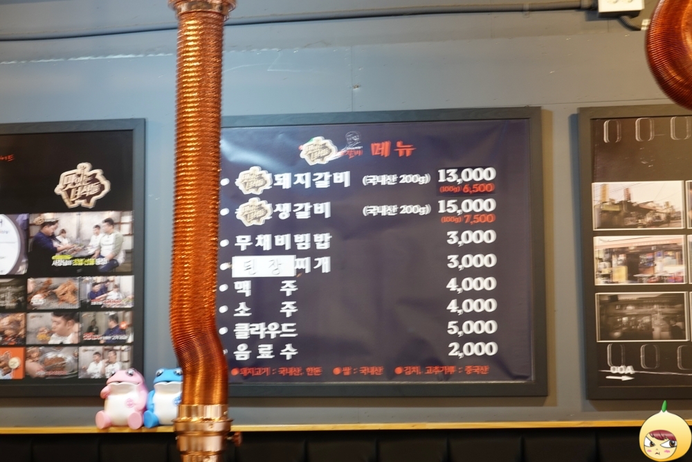 방송으로 봤을때는 꽤 넓다고 생각했는데, 막상 가보니 그리 넓지는 않다. 영업시간이 5시부터인데, 워낙 유명한 곳이라서 줄서서 기다려야 할까봐 5시 5분에 도착을 했더니 빈자리가 많다. 온도 체크와 QR코드를 작성한 후 자리에 앉았다. 메뉴는 양념돼지갈비 하나만 있는 줄 알았는데, 생갈비도 있다. 둘 다 먹을까 하다가, 가장 궁금한 양념돼지갈비(200g 13,000원)와 무채비빔밥(3,000원)을 주문했다. 그리고 당연한듯 알콜을 마셔야 하지만, 금주를 선언했기에 사이다를 주문했다.
