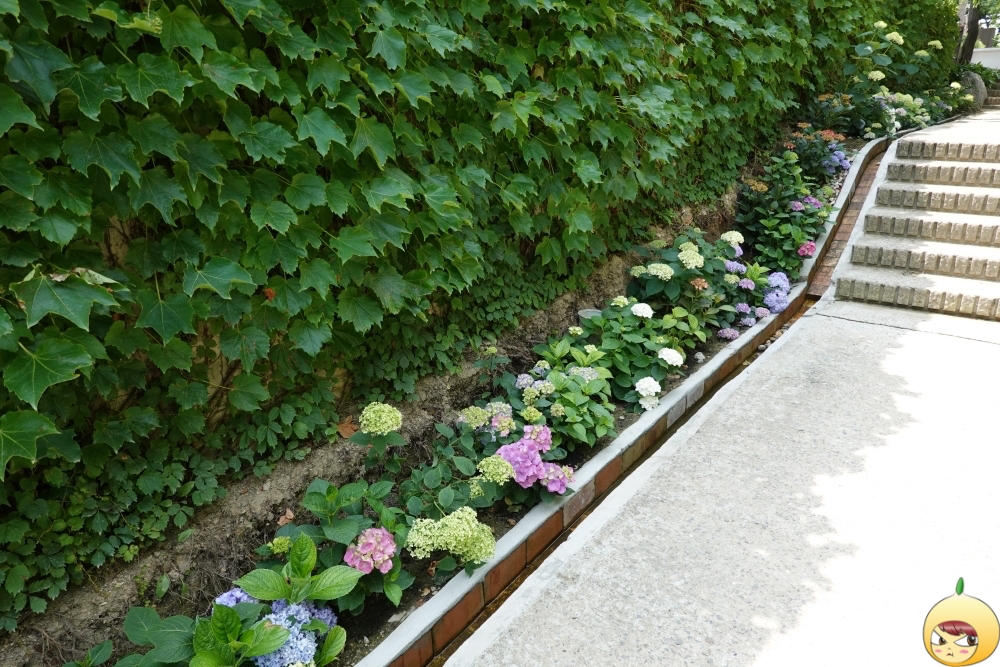 시간의 정원 끝부분이라고 해야 할까나? 담쟁이덩굴 아래 살포시 수국이 피었다. 군락지라고 할 정도는 아니지만, 소담스럽게 핀 수국이다. 수국을 참 좋아하는데, 예상치 못한 곳에서 이렇게 선물처럼 만나니 아니 좋을 수 없다.