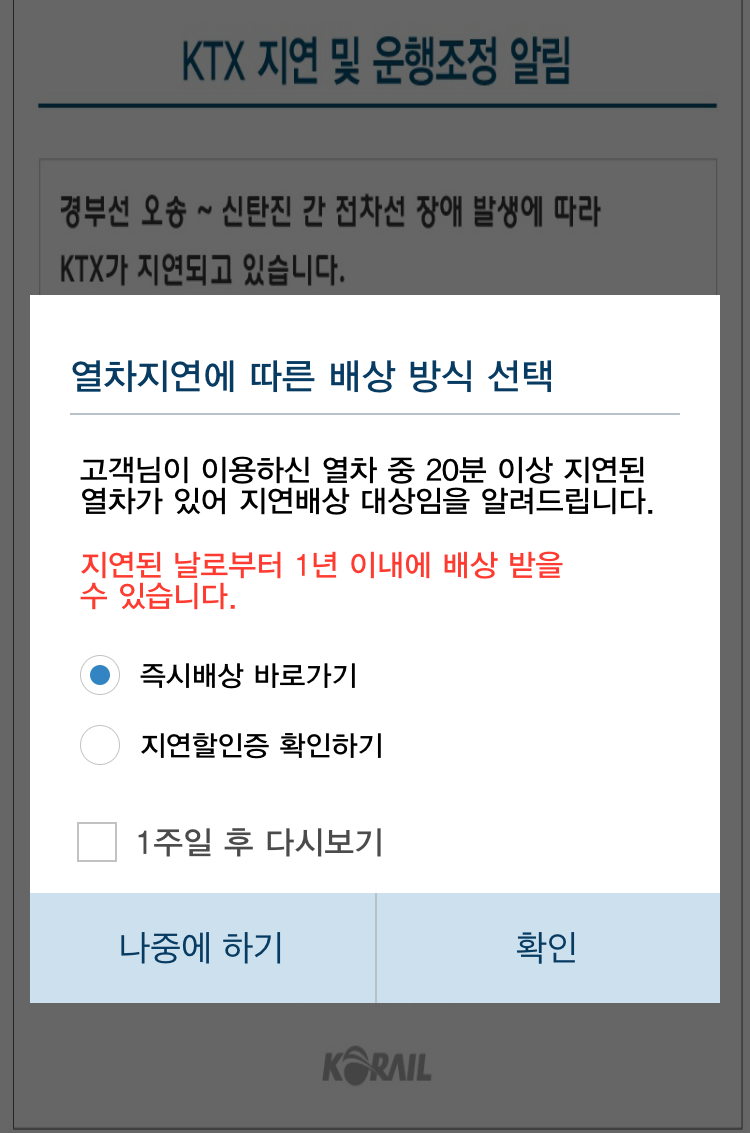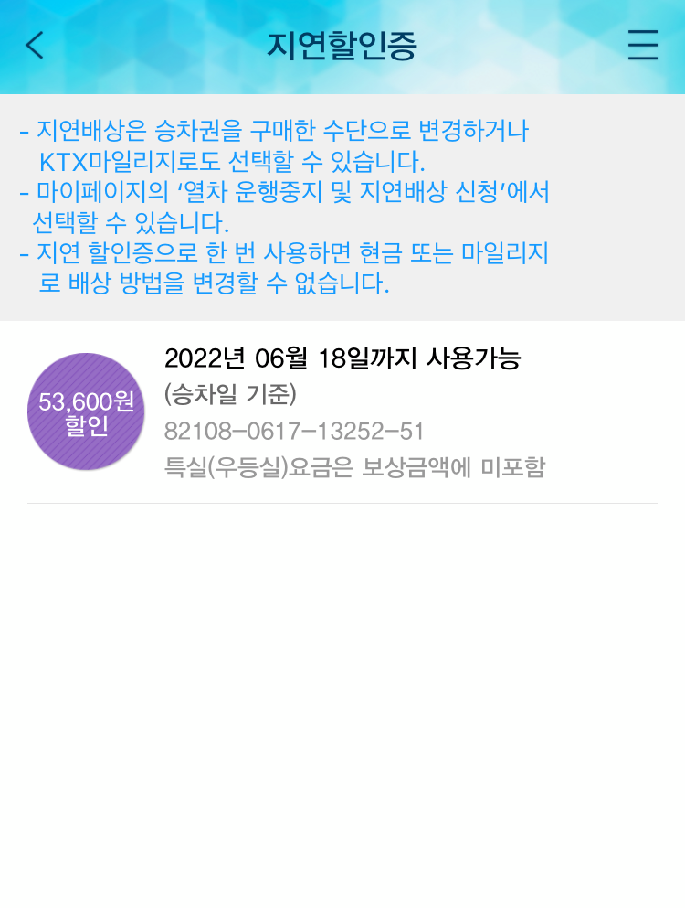 여기서 특실요금은 포함되지 않고, 지연할인증으로 한번 사용하면 현금이나 마일리지로 배상방법을 변경할 수 없다고 한다.