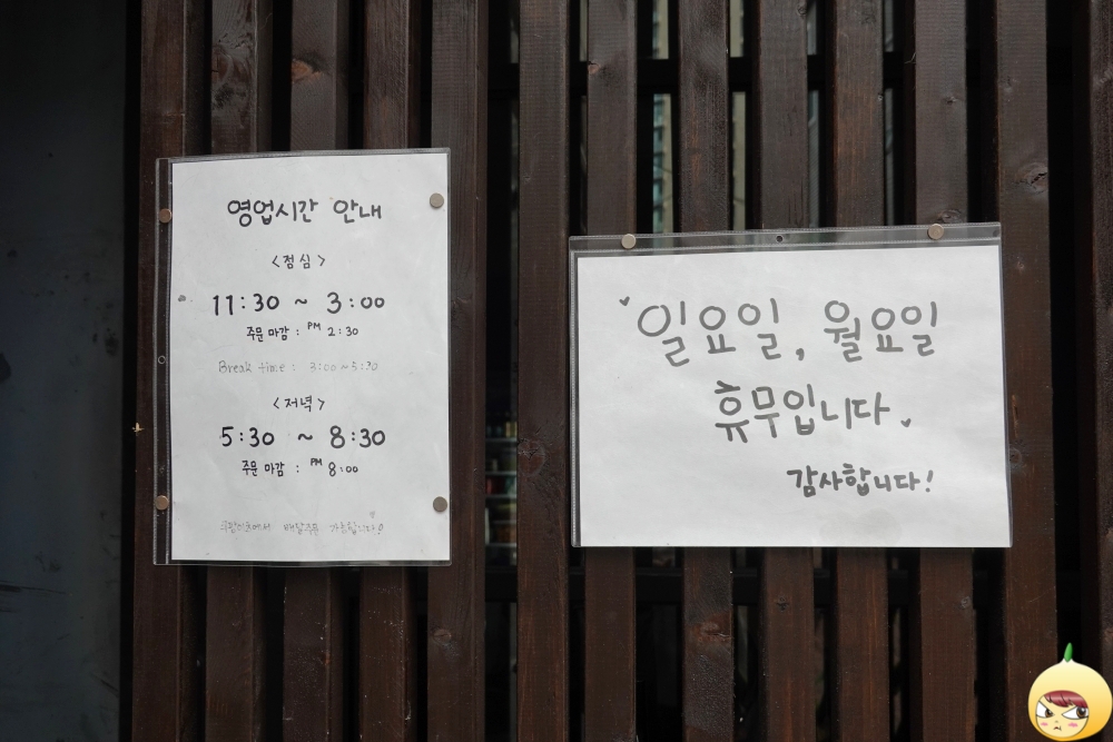 브레이크타임은 오후 3시부터 5시 30분까지다. 점심 영업시간은 11시 30분에서 3시까지 하기에, 12시를 지나 1시 언저리에 간다. 그때가 혼밥하기 좋은 시간이기 때문이다. 일요일과 월요일은 휴무.