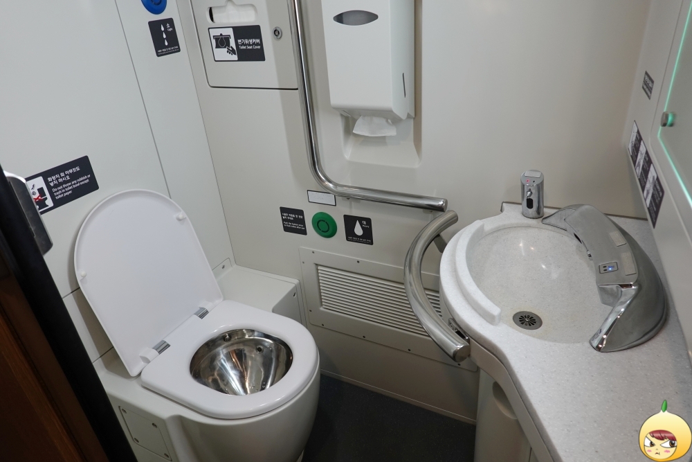 1호실과 2호실 사이에 있는 화장실이다. 장애인용 화장실은 여기보다 더 넓다. 정말 급한 일이 아니면 기차에서 화장실을 이용하지 않기에, 사진만 찍고 후다닥 문을 닫았다. 청량리역에서 기차를 타자마자 찍었기에 아무도 이용하지 않은 화장실이라고 할 수 있다.