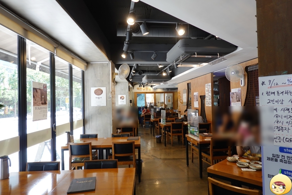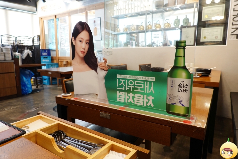바쁜 점심시간에는 줄서서 기다려야 하지만, 조금만 늦게 오면 기다림 없이 바로 먹을 수 있다. 칸막이에도 광고를 하다니, 소주회사는 마케팅을 참 잘한다. 옆테이블에서 제니가 혼술을 하고 있는 듯한 착각 아닌 착각을...