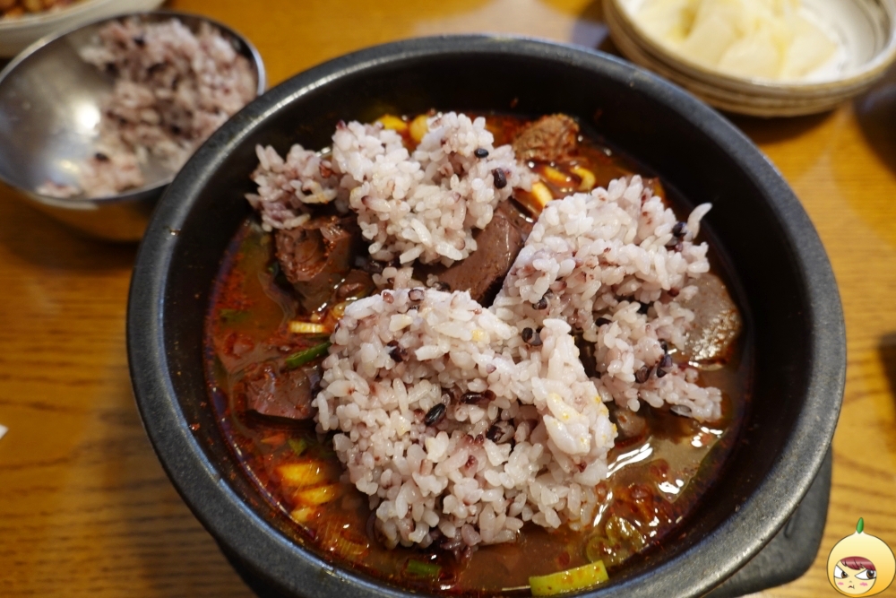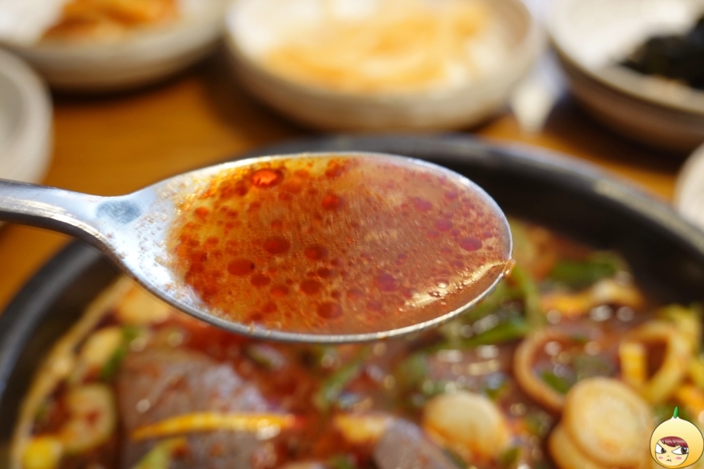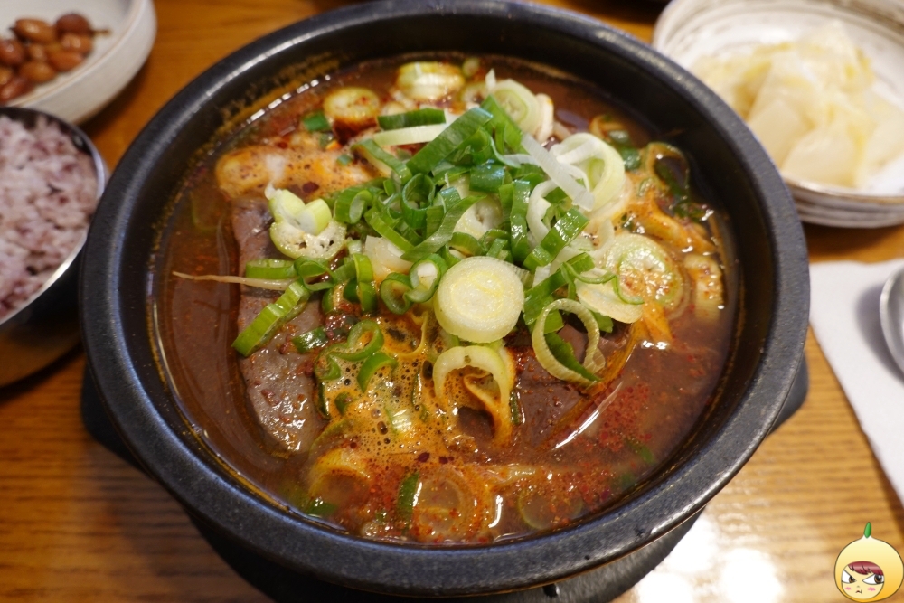 얼큰해장국이지만, 얼얼할 정도의 매운맛은 아니다. 신라면 정도랄까? 매운 음식 못 먹는 1인인데, 이건 물도 마시지 않고 먹을 수 있을 정도로 맵지 않다. 파국까지는 아니지만, 파가 푸짐하게 들어있다.