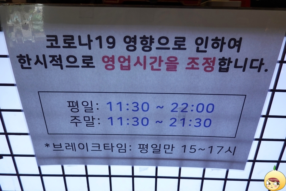 오후 2시부터 브레이크 타임인 줄 알았는데, 코로나19로 인해 오후 3시부터 5시까지 브레이크타임이다. 혼밥을 할때는 늦은 오후에 가는 일이 많아서 쉬는 시간을 꼭 확인해야 한다.