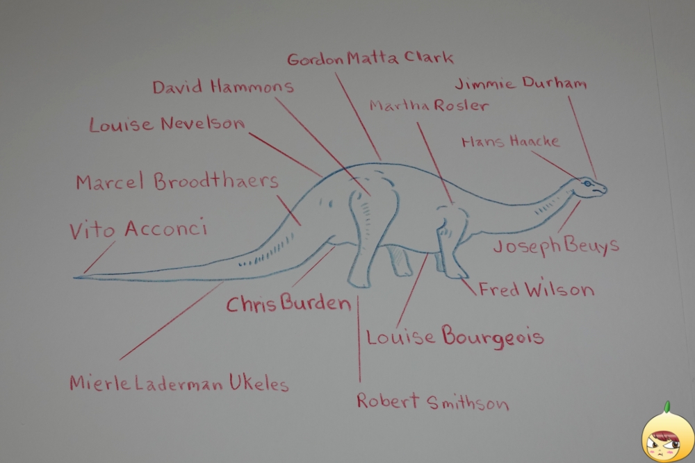 타르 웅덩이에 빠져 화석으로 굳어버린 공룡의 멸종을 암시하는 작품이다. 그 아래 청소도구함은 박물관이 예술 작품의 성역이 되기 위해 감춰왔던 이면을 보여준다.