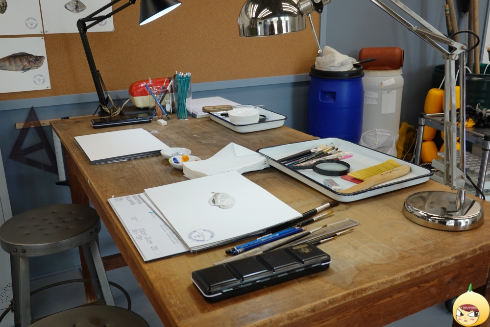 알코올 냄새와 바다 생물의 비릿한 냄새가 코를 찌르는 디온의 연구실에는 오래된 학자의 책상과 그 뒤로 서 있는 철제 캐비닛에 진열된 다양한 해양생물의 표본들이 있다. 맞은편에는 생물들을 관찰하고 기록하는 드로잉 작업대가 있으며, 그 위에는 물감들과 표본을 제작할때 사용하는 주사기가 놓여있다.