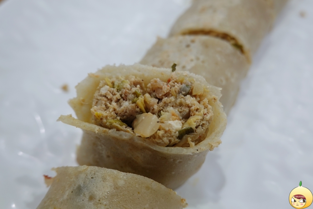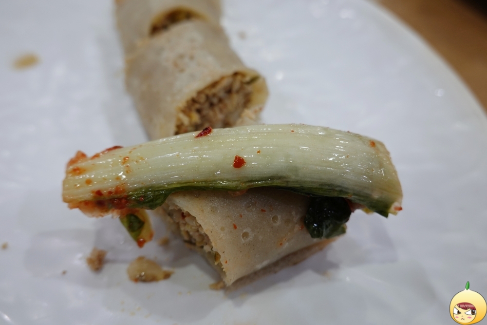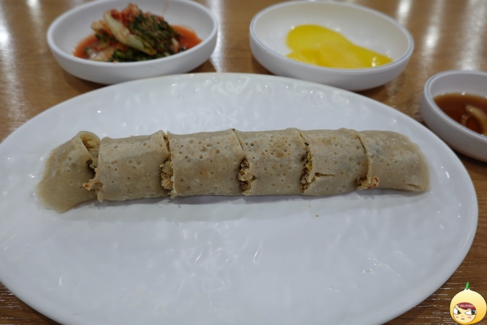 메밀의 맛과 향을 느끼기 위해서는 바삭함은 버려야 한다고 생각한다. 군만두는 튀기듯 바삭하게 만들어야 하지만, 메밀전병은 지지듯 부쳐야 한다. 순박한 메밀전 안에는 만두소처럼 고기와 김치가 들어있다. 내용물은 풍미만 더할뿐 양념이 강하지 않아 구수한 메밀전 맛이 더 살아난다.