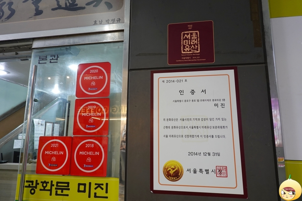 서울미래유산 청진동 광화문미진 본점 SINCE1954. 굳이 무슨 말이 필요할까 싶다. 역사가 이곳을 말해주고 있기 때문이다. 광화문에 신흥강자가 많지만, 시원하고 슴슴한 장국에 툭 끊어지는 투박