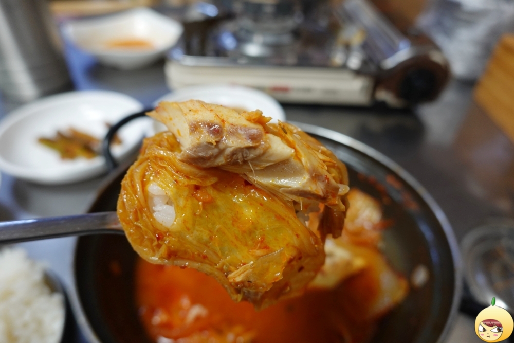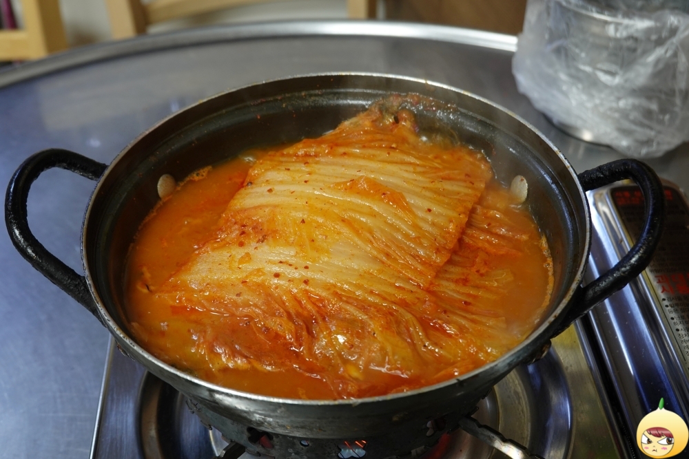 요렇게만 보면 김치찌개라 생각할 수 있을거다. 충분히 그럴 수 있다. 하지만 저 안에 뭐가 들어 있는지 아는 사람은 투시력이 없어도 고등어가 보인다. 김치찜이면 김치가 흐물흐물해야 하는데, 꽤 짱짱해 보인다. 허나 착시현상일 뿐, 가위없이 젓가락만으로도 김치를 쉽게 자를 수 있다.