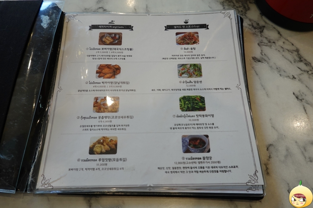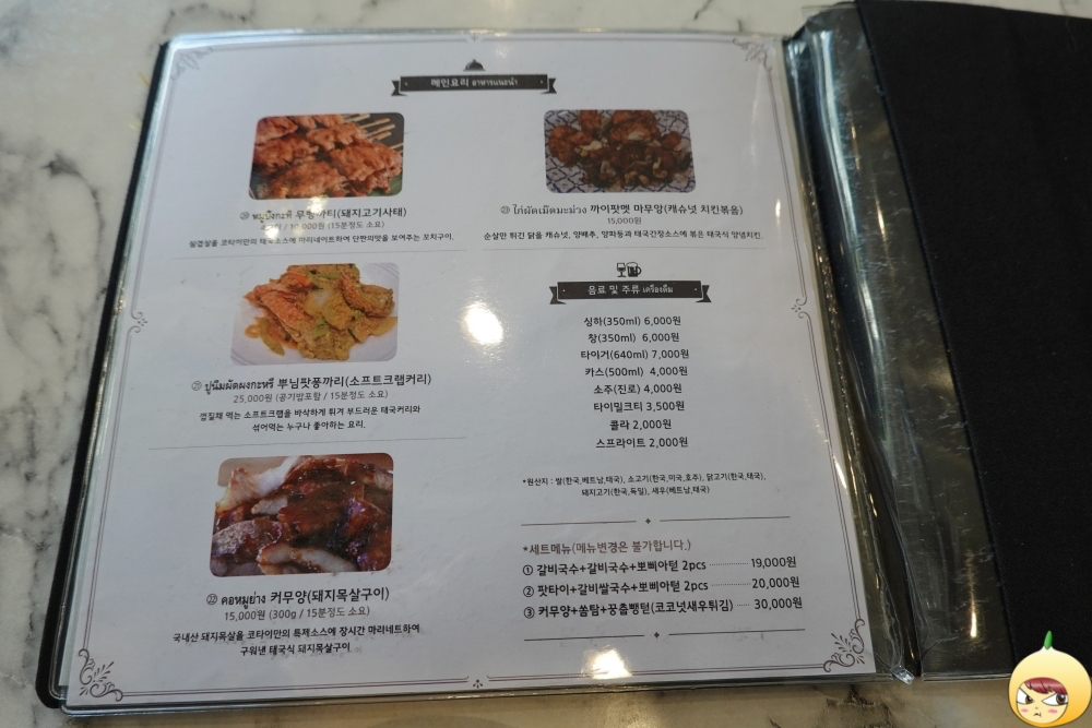 태극 음식점의 특징이라면 메뉴가 겁나 많다는 거다. 메뉴판도 여러 페이지로 되어 있는데, 첫페이지를 벗어나지 못하고 있다. 왜냐하면 먹고 싶은 똠양꿍(12,000원)이 있으니깐. 그리고 함께 마실 타이거맥주(7,000원)는 마지막 페이지에서 찾았다.