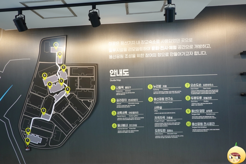 용산공원에 들어오면, 가장 먼저 나들목을 통과해야 한다. 왜냐하면 QR체크도 해야하고, 공원에 들어가기 전 출입증을 받아야 하기 때문이다. 건물 안에는 커다란 지도와 함께 10가지 볼거리를 소개하고 있다. 작은 리플렛이 있으니, 대충 이런 것들이 있구나 하면서 파악만 하면 된다.