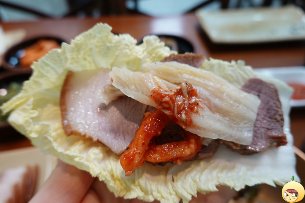 고기가 5~6점이 나왔는데, 혼자 먹기에 부족하지도 과하지도 않다. 비계가 있어 살짝 걱정(비계 못 먹는 1인)을 했는데, 살코기 부분이 더 많아서 일부러 빼고 먹지 않았다. 따뜻하지 않아 고기가 퍽퍽할 줄 알았는데, 부드럽다까지는 아니더라도 질기지 않고 적당히 쫄깃하니 괜찮다. 특히, 누린내가 1도 없어서 가장 좋았다.