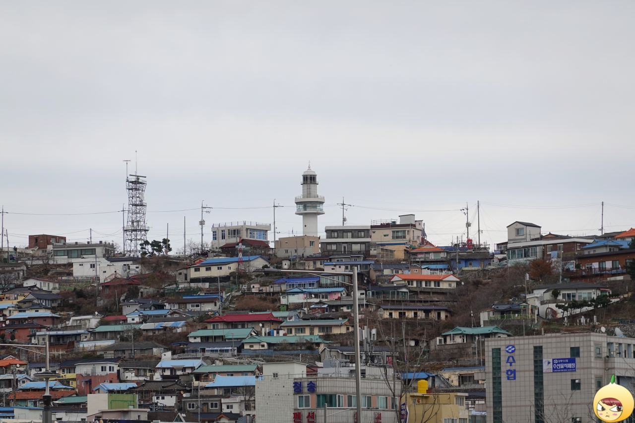 항구 옆에 산(혹은 언덕)이랄까? 묵호등대가 어디에 있나 했더니, 바로 저기에 있다. 오이도에 있는 빨간등대는 평지에 있는데, 묵호등대는 산 정상에 있다. 살짝 높아 보이긴 하나, 여기까지 왔는데 멀리서 보고 갈 수는 없다. '기둘려라~ 너를 만나러 간다 간다 간다.'