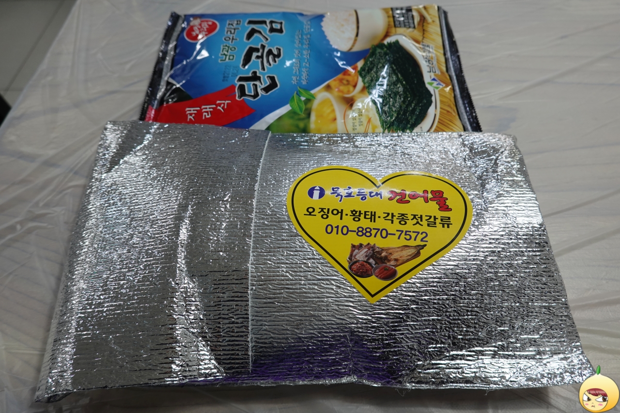 그냥 반건조 오징어도 있지만, 반건조 파지 오징어를 골랐다. 이유는 간단하다. 구멍나고 찢어지면 상품가치가 떨어지니, 가격도 같이 떨어진다. 10마리에 3만원을 2만 5천원 샀고, 집에 가서 확인을 하니 11마리가 들어 있다. 마수걸이에 현금 결제까지 서비스로 파래구이김에 종이컵 가득 대구포도 받았다.
