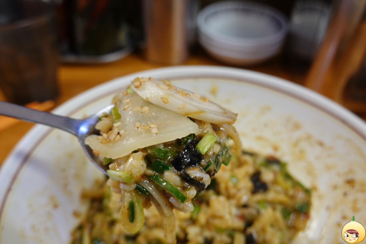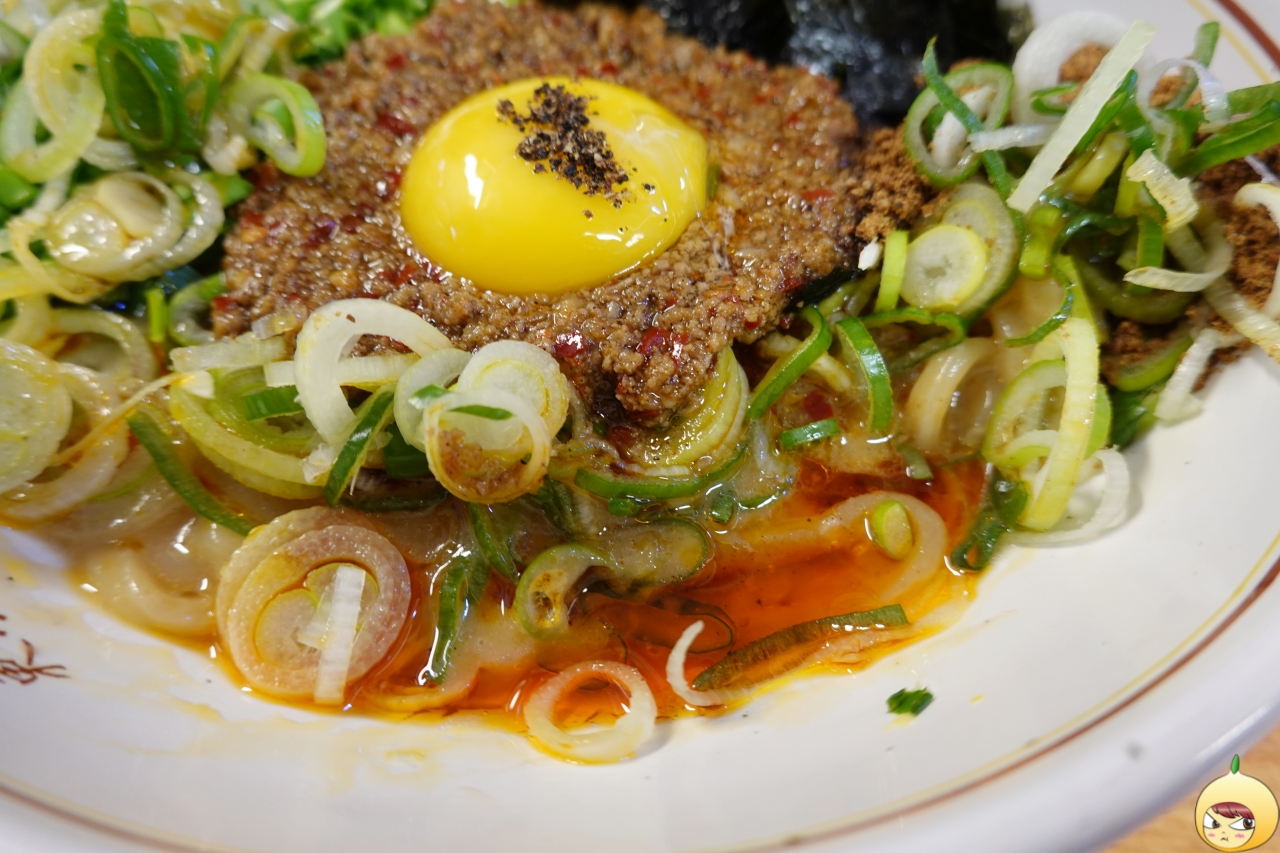 마제소바, 이름도 생소하더니, 비주얼은 더 생소하다. 가운데 노른자가 있고, 그 아래는 민찌인듯 싶다. 노른자를 주변으로 부추와 파가 가득 들어 있고, 검은 물체는 생김이다. 그나저나 라면스프같은 가루는 뭘까 했는데, 아무래도 어분인가보다. 가루만 맛을 살짝 봤는데, 감칠맛까지는 아니지만 고소한 맛이 난다.