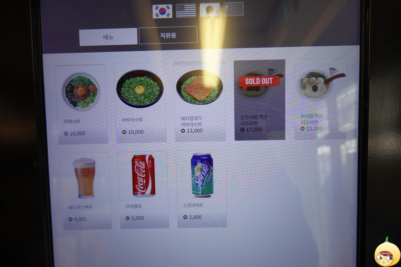 메뉴판은 따로 없지만, 키오스크에 자세히 나와 있다. 비빔국수 아니고 비빔라멘인 마제소바와 아부라소바 그리고 트러플백합 시오라멘이 있다. 그나저나 돼지껍데기 아부라소바라니 와우~ 저건 영원히 못 먹는다. 처음 왔으니 이 집의 시그니처라 할 수 있는 마제소바(10,000원)와 반숙 삶은계란(1,500원)을 주문했다.