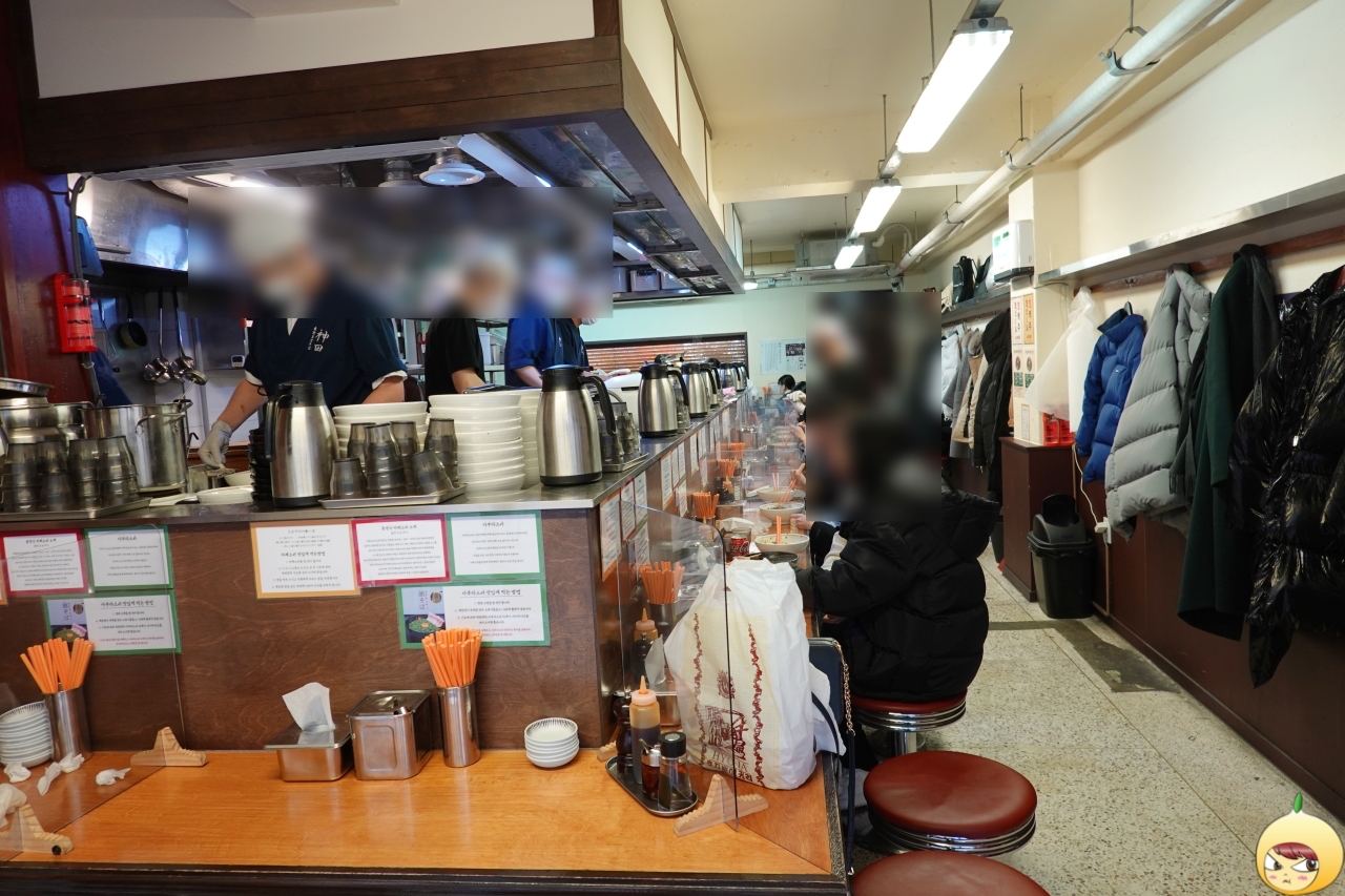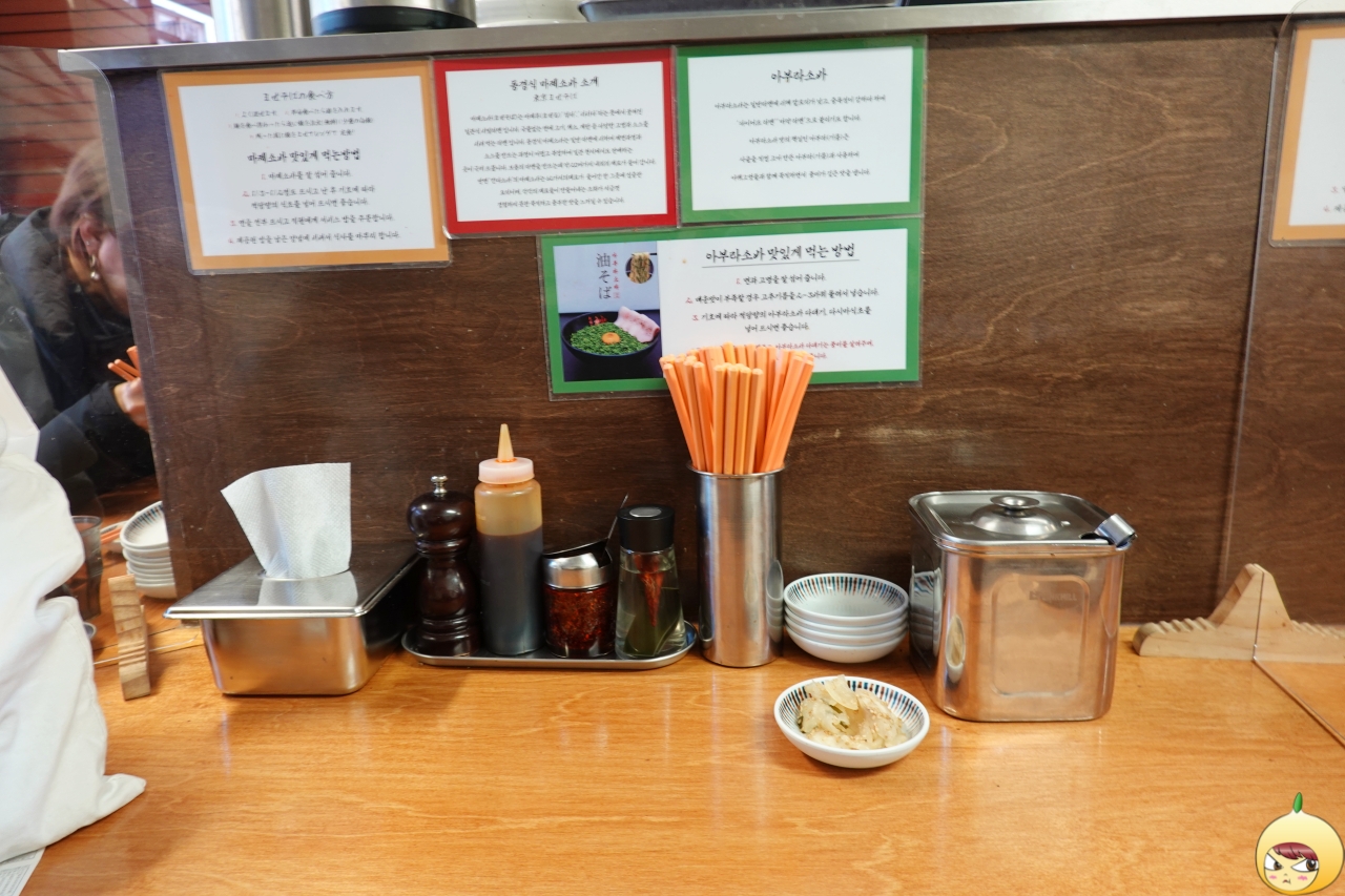 웨이팅만 없을뿐, 안은 빈자리가 없을 정도로 만석이다. 내부는 바테이블로 되어 있는데, 안쪽에는 자리가 없어 비닐봉다리가 있는 저기에 앉았다.