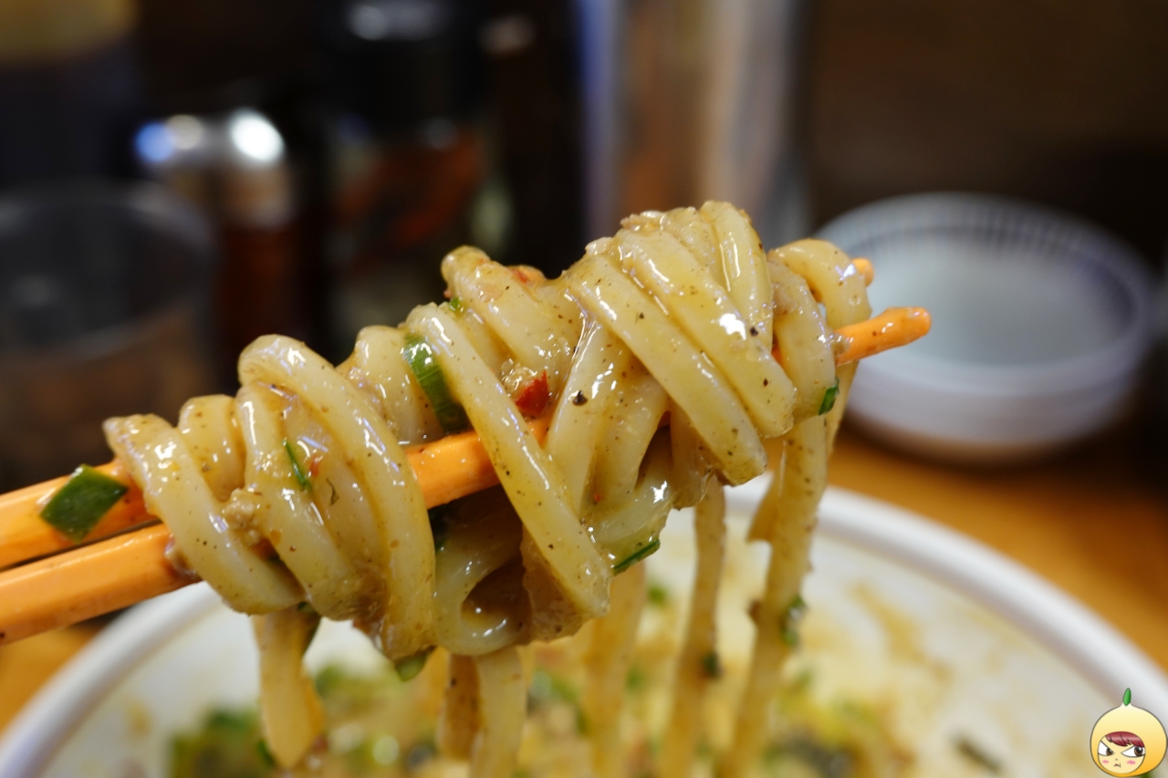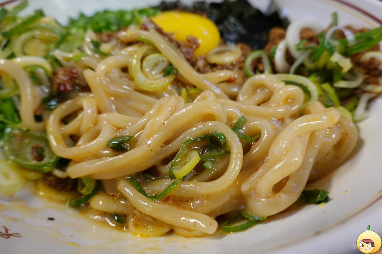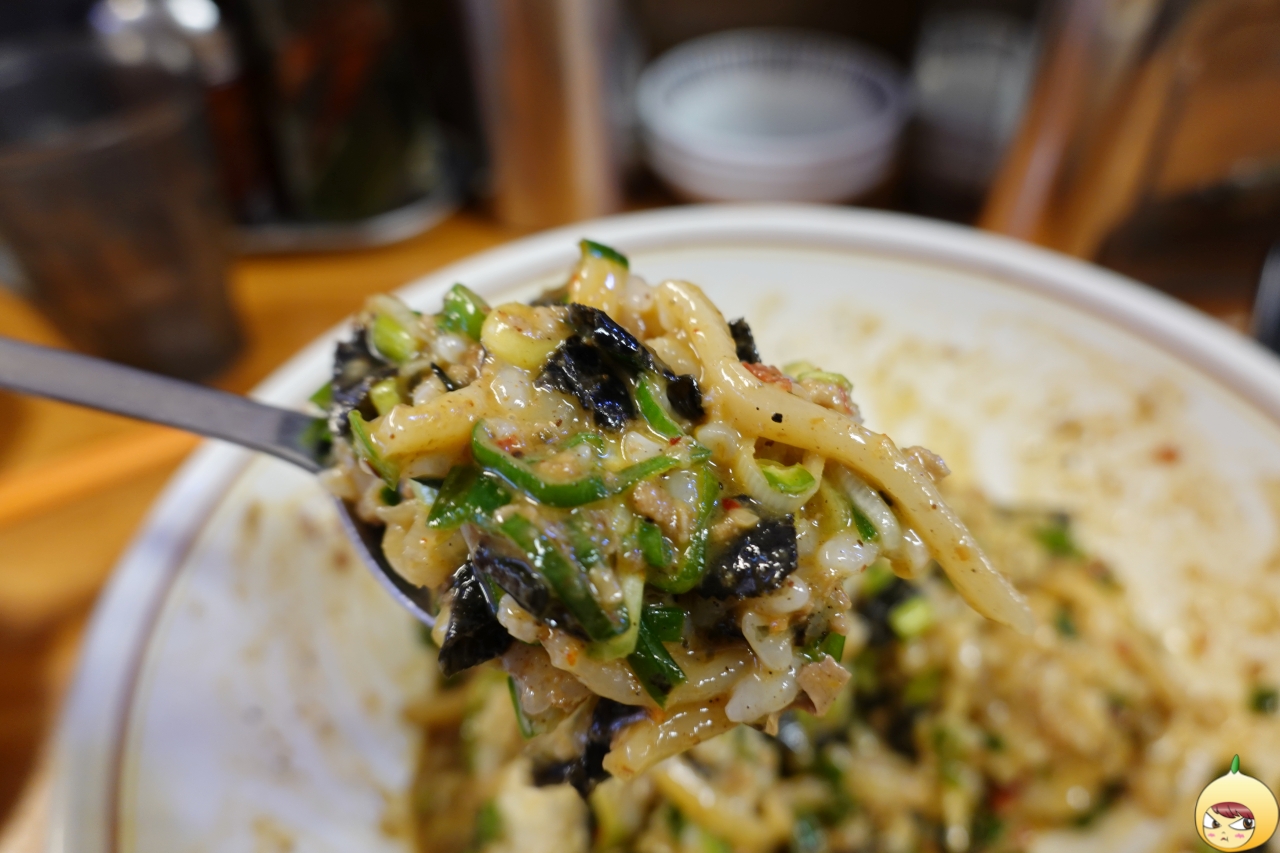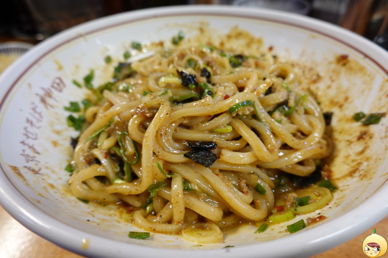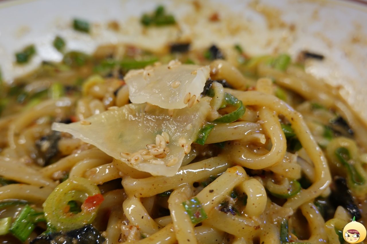 국물이 전혀 없지는 않고, 비비기 위한 최소한의 국물이 들어 있다. 그런데 면은 비벼서 나왔는지, 걸쭉한 국물이 면을 감싸고 있다.