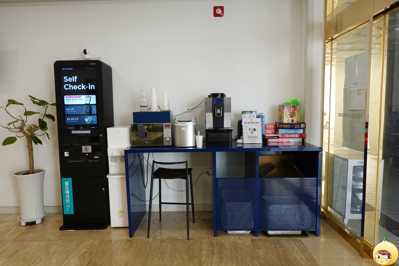로비 옆으로 엘리베이터가 있고, 그 앞에 커다란 쇼파와 향수존이 있다. 여기에 앉아서 사람을 기다려야 하는 줄 알았는데, 아니다. 맞은편으로 보드게임과 얼음 및 커피 자판기가 있는데, 그 옆으로 셀프 체크인이라는 키오스크가 있다. 통화 중에 둔탁한 소리가 들리더니, 키오스크에서 카드키가 자동으로 나왔다.