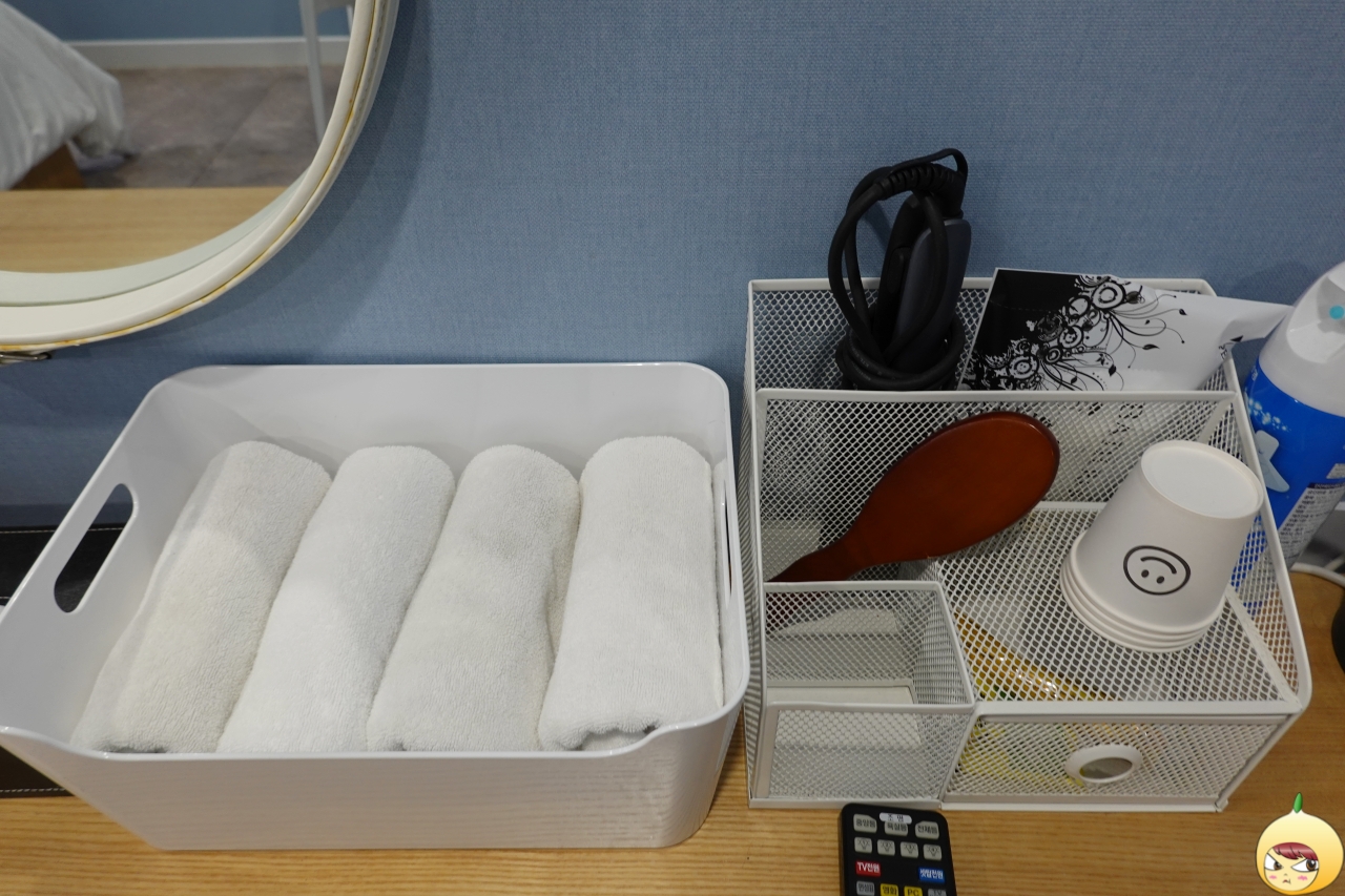 없어보이는데, 살펴보면 있은 건 다 있다. 드라이가 따로 있으니 저건 고데기인가? 쓸 일이 없기에 꺼내지 않아서 확실하지 않다. 종이컵 아래에 믹스커피와 녹차티백이 들어 있다. 커다란 목욕 타월은 없지만, 수건은 4개가 있다.