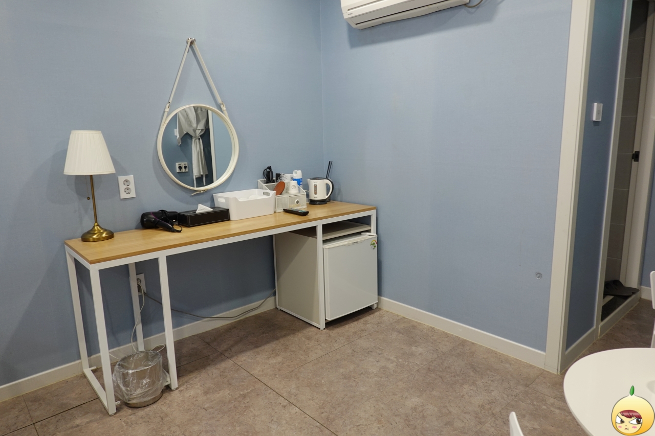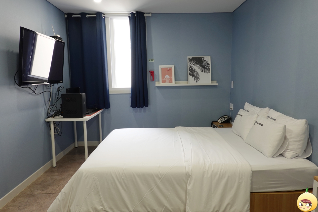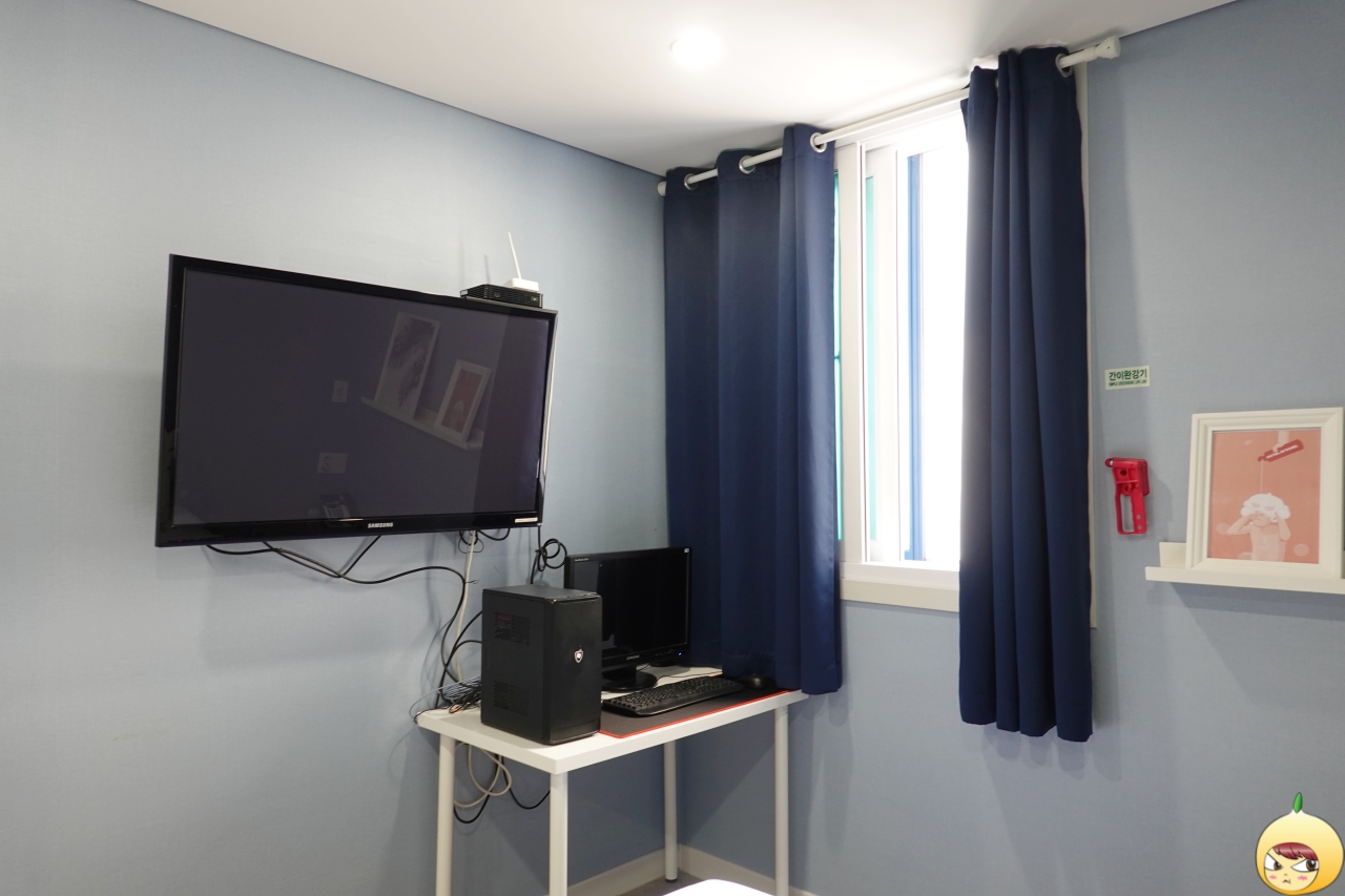 환기를 위해 창문이 열려있다 보니, 방에는 냉기가 흐른다. 커다란 더블침대와 TV, 화장대, 테이블 등 있을 건 다 있는데도, 공간이 답답하지 않고 여유롭다. 바닥은 카펫이 아니라 장판이며, 벽지는 연한 블루컬러다.