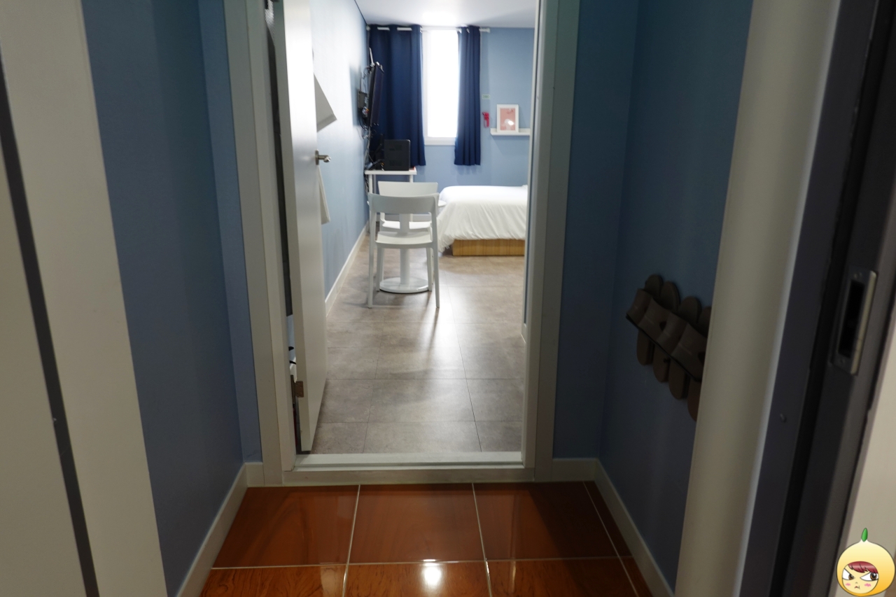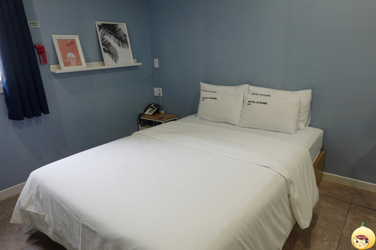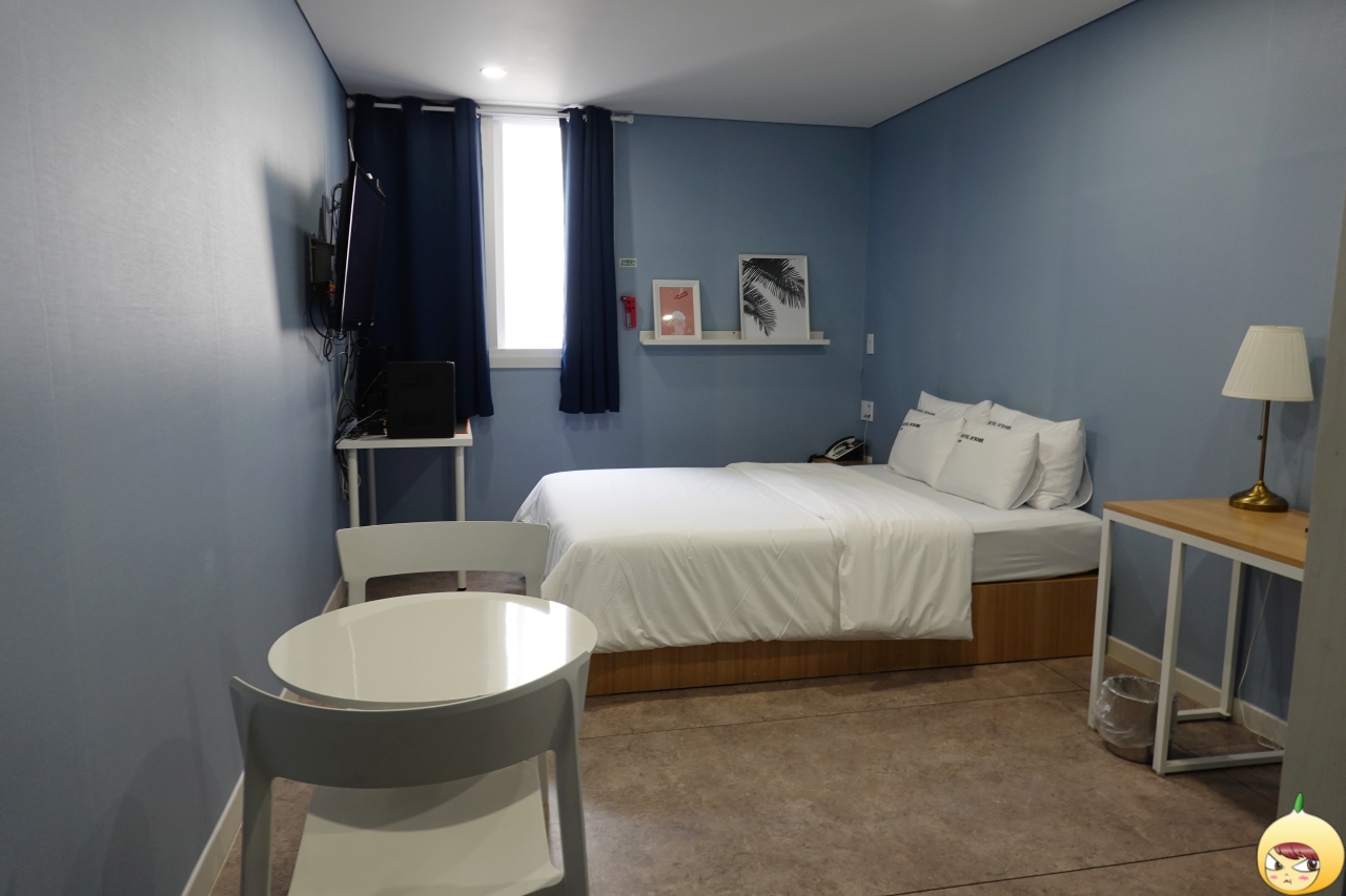 환기를 위해 창문이 열려있다 보니, 방에는 냉기가 흐른다. 커다란 더블침대와 TV, 화장대, 테이블 등 있을 건 다 있는데도, 공간이 답답하지 않고 여유롭다. 바닥은 카펫이 아니라 장판이며, 벽지는 연한 블루컬러다.