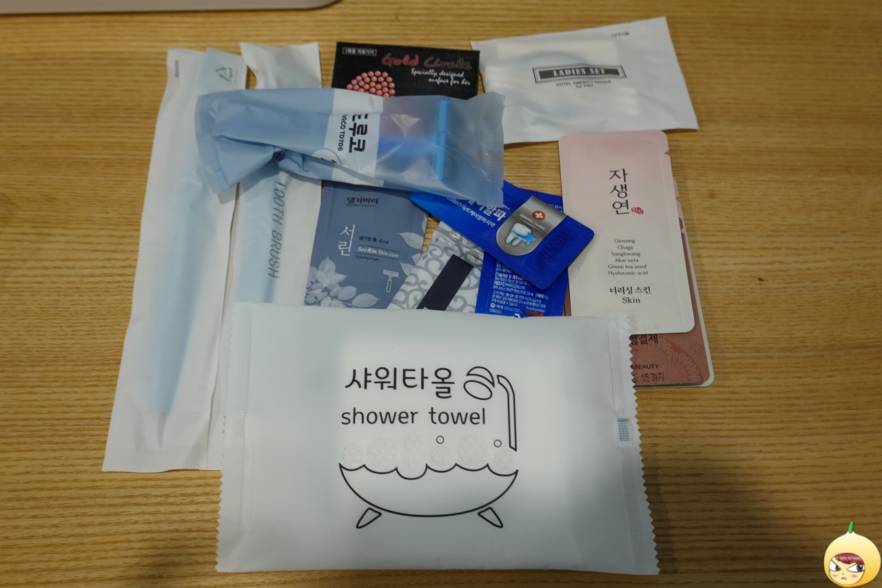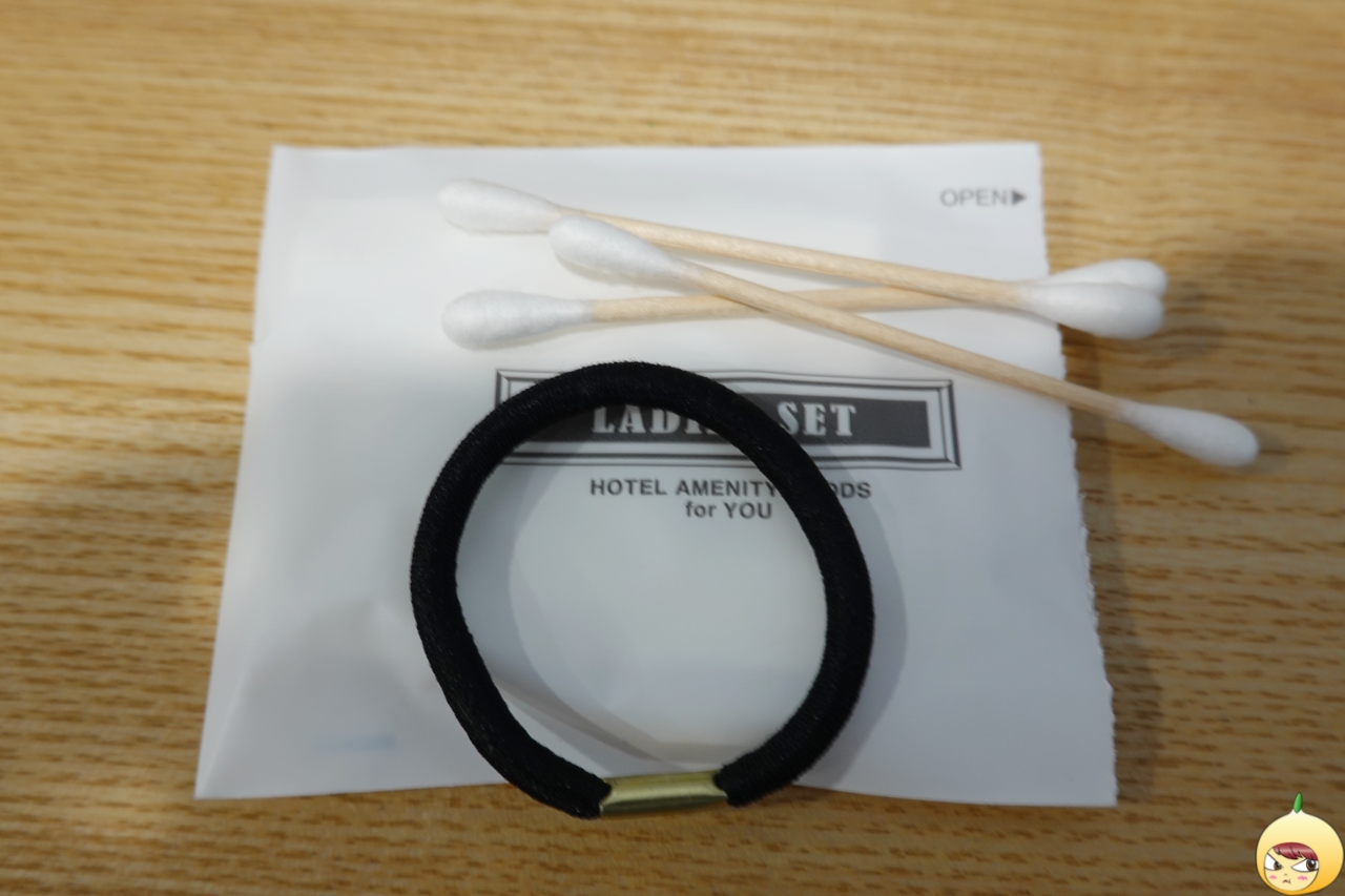 고데기 옆 비닐봉다리는 어메니티다. 칫솔에 면도기 그리고 스킨 등 역시나 있을 건 다 있다. 세면도구와 화장품은 집에서 챙겨왔지만, 면봉과 머리끈이 없어서 요거 하나만 사용했다.