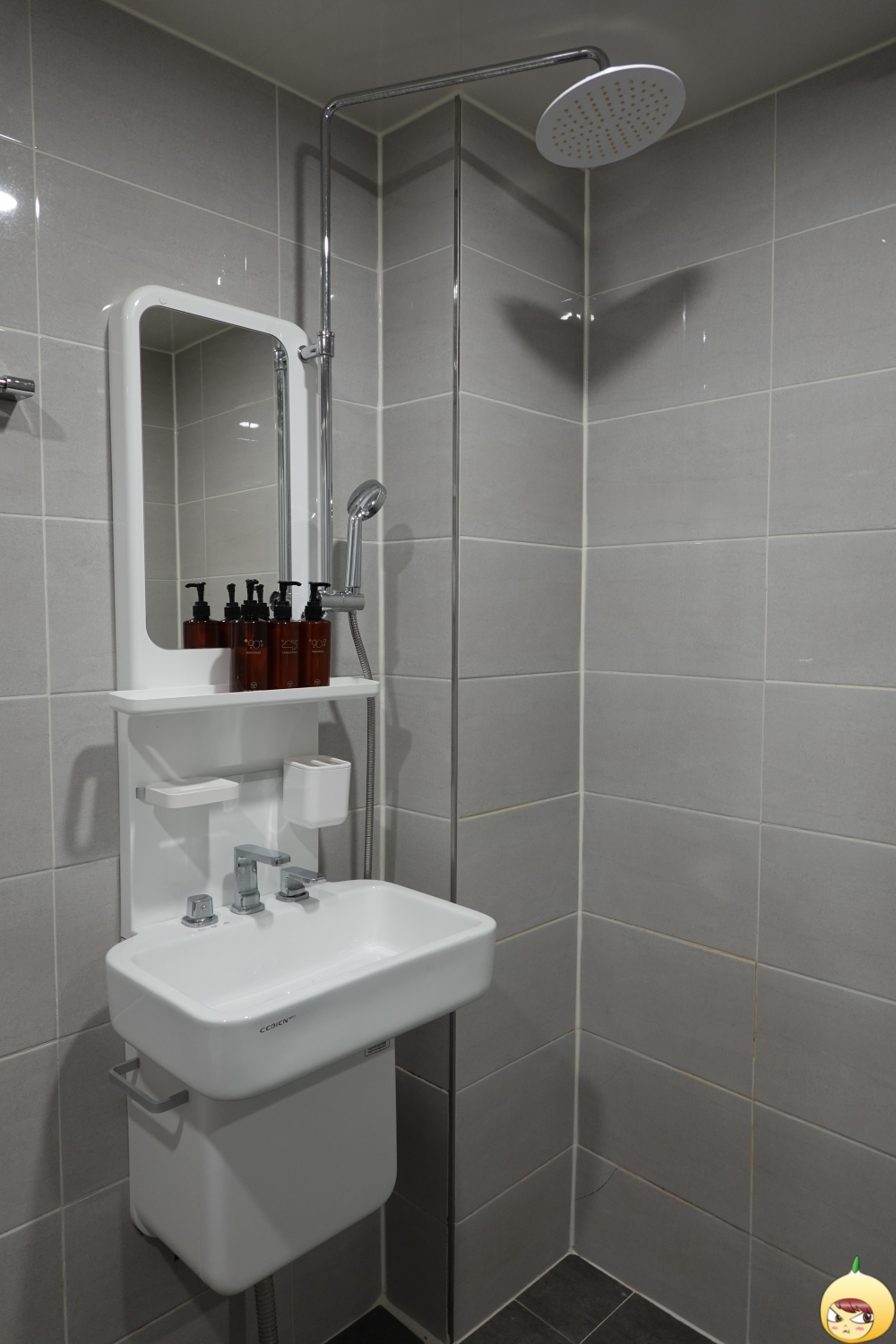 겨울이라서 욕조가 있었음 했지만, 아쉽게도 없다. 해바라기 샤워기도 있고, 작은 샤워기도 있다. 더운물, 찬물 잘 나오고, 수압도 괜찮다. 비누에 고체치약와 칫솔 그리고 샴푸, 린스까지 다 챙겨 갔기에 비어있는 공간에 하나씩 꽂아넣었다. 하룻밤이지만, 나만의 욕실로 만들고 싶으니깐.